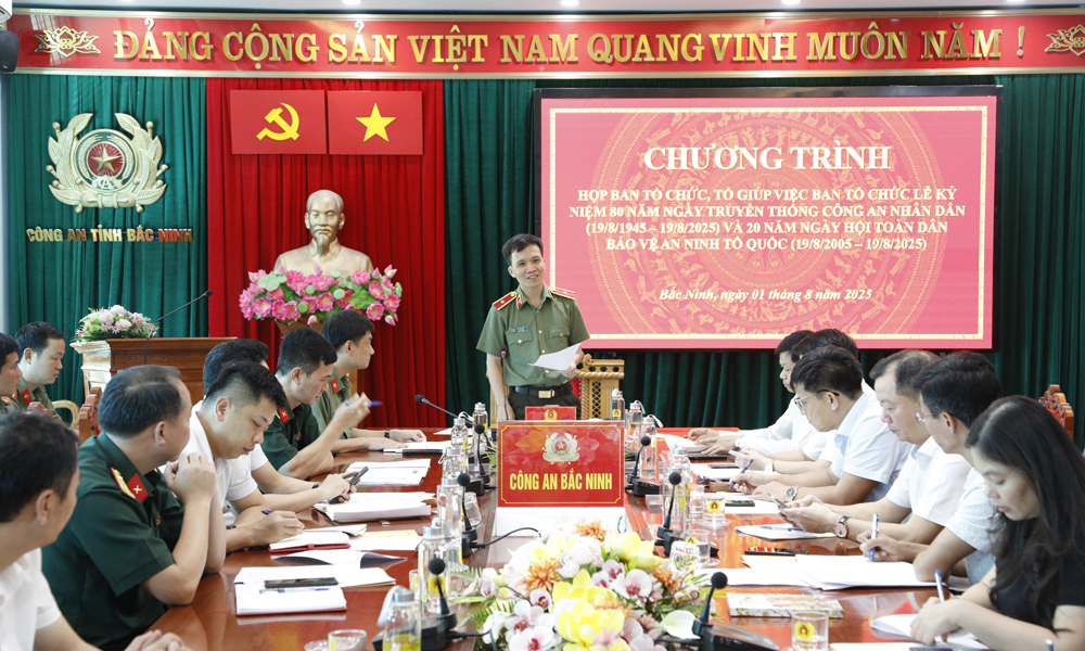 BẮC NINH - Chiều 1/8, Công an tỉnh Bắc Ninh tổ chức họp Ban Tổ chức và Tổ giúp việc nhằm rà soát, chuẩn bị tốt các điều kiện phục vụ Lễ kỷ niệm 80 năm Ngày truyền thống Công an nhân dân Việt Nam 19/8 (1945- 2025) và 20 năm Ngày hội toàn dân bảo vệ an ninh Tổ quốc 19/8 (2005- 2025). Thiếu tướng Bùi Duy Hưng, Ủy viên Ban Thường vụ Tỉnh ủy, Giám đốc Công an tỉnh chủ trì cuộc họp.