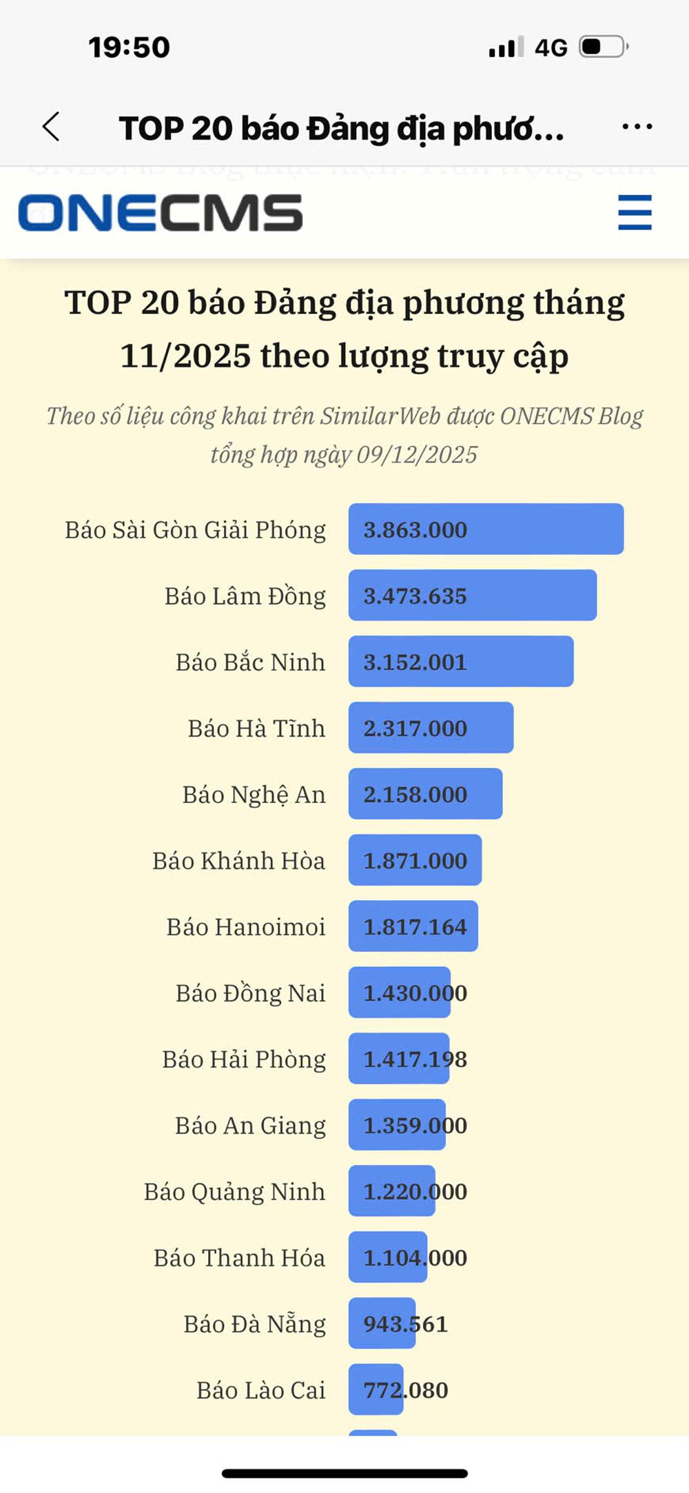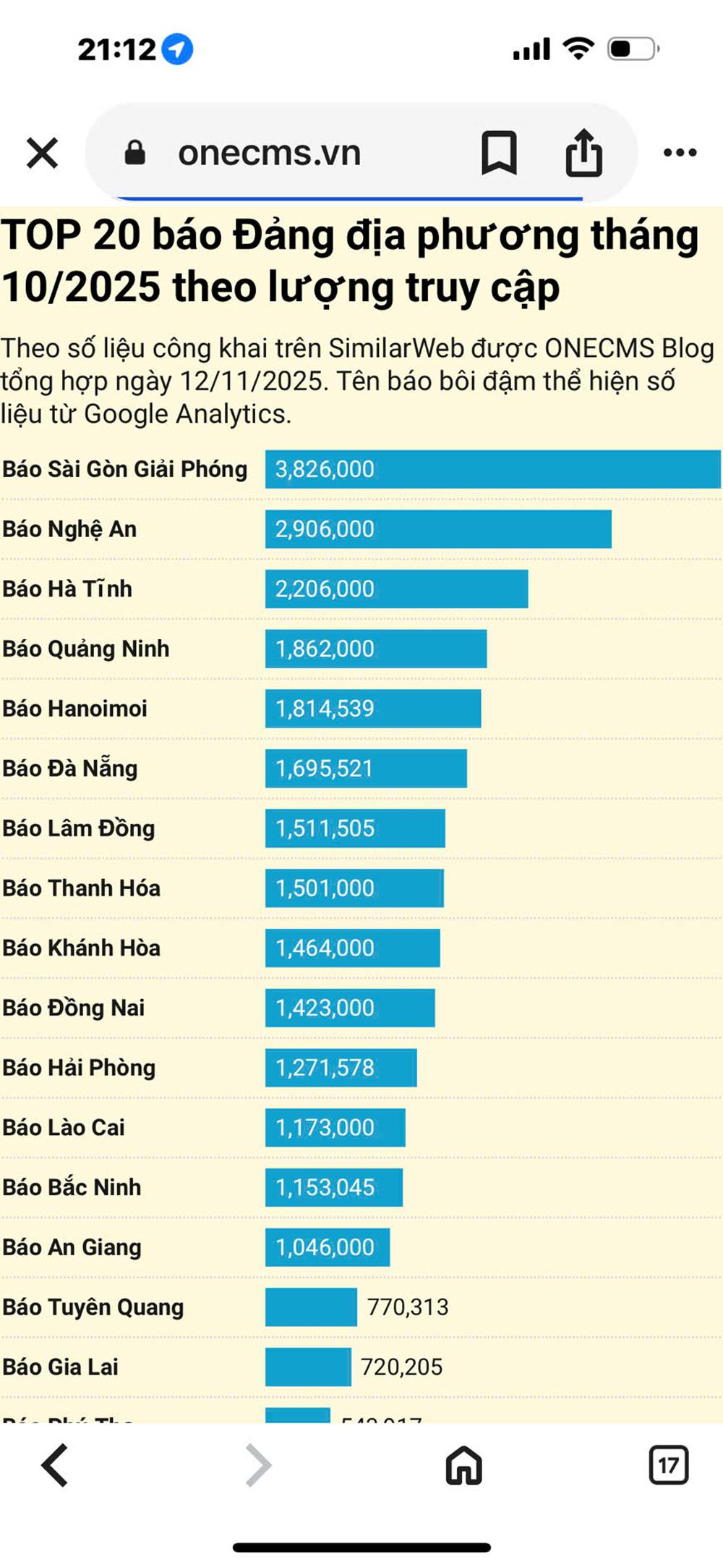 Theo dữ liệu công khai trên SimilarWeb, do ONECMS Blog tổng hợp ngày 09/12/2025, hơn 3,1 triệu lượt truy cập trong tháng 11 là con số biết nói. Mỗi lượt truy cập là một lần bạn đọc trao gửi niềm tin vào thông tin chính xác, hữu ích mà Báo Bắc Ninh mang tới cộng đồng. Kết quả này tiếp tục khẳng định vị thế và sức hút của Báo và PTTH Bắc Ninh trong hệ thống báo chí địa phương, đồng thời là sự ghi nhận xứng đáng cho nỗ lực bền bỉ của toàn thể những người làm báo trong tòa soạn.