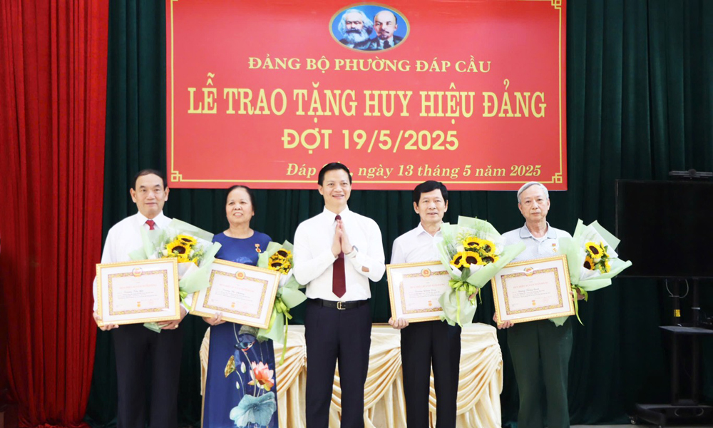 Phó Bí thư Tỉnh ủy, Chủ tịch UBND tỉnh Vương Quốc Tuấn trao Huy hiệu Đảng đợt 19/5/2025 cho các đảng viên thuộc Đảng bộ phường Đáp Cầu (cũ), nay thuộc phường Vũ Ninh. |