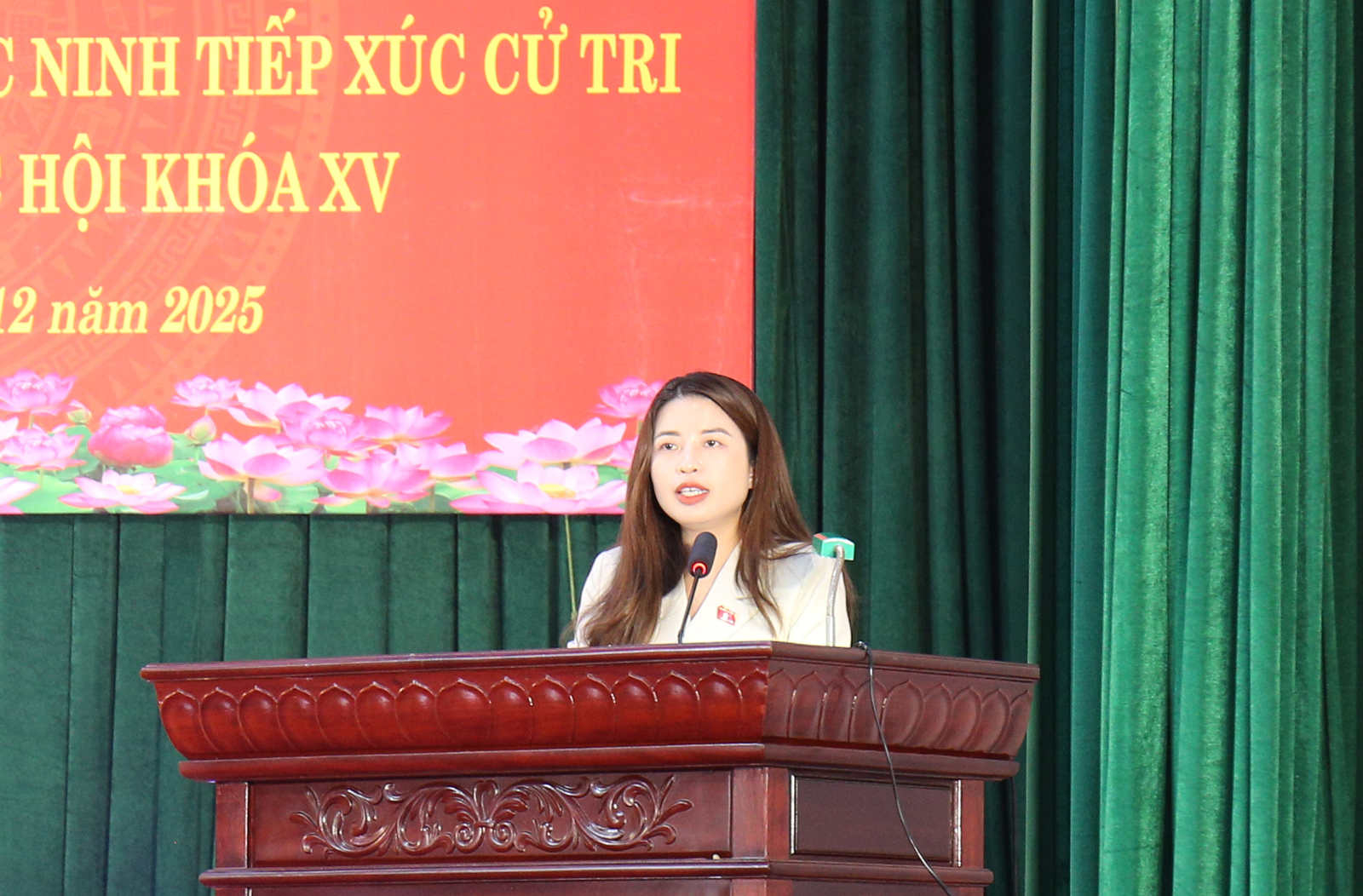 ĐBQH tỉnh Nguyễn Thị Hà báo cáo tại buổi tiếp xúc cử tri.