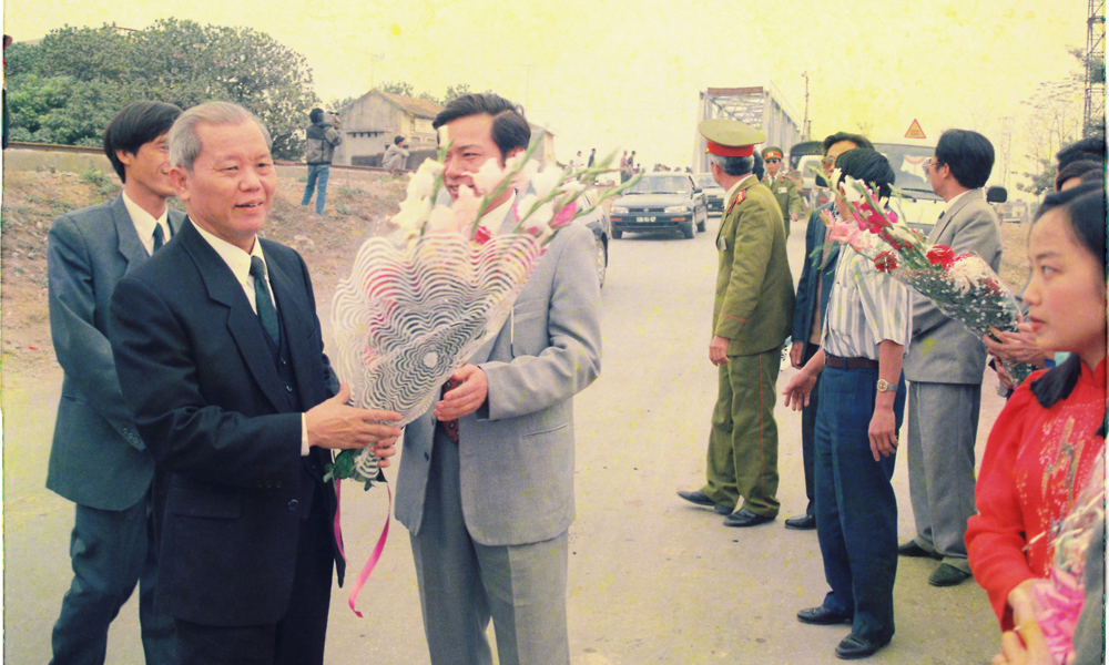 | Đồng chí Ngô Đình Loan chia tay lãnh đạo tỉnh Bắc Giang tại đầu cầu Thị Cầu trước ngày tái lập hai tỉnh Bắc Giang, Bắc Ninh (ngày 31/12/1996). Ảnh: Việt Hưng. |