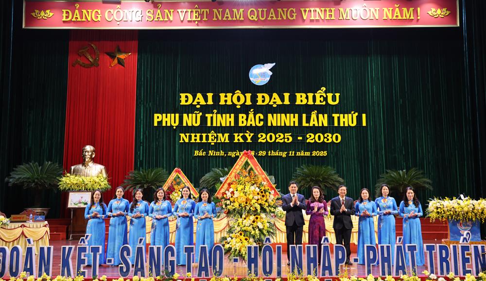 | Các đồng chí lãnh đạo Trung ương Hội Liên hiệp Phụ nữ Việt Nam và lãnh đạo tỉnh chúc mừng Ban Chấp hành Hội liên hiệp Phụ nữ tỉnh Bắc Ninh khóa I. |