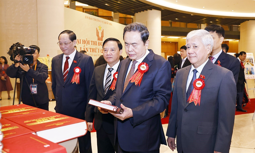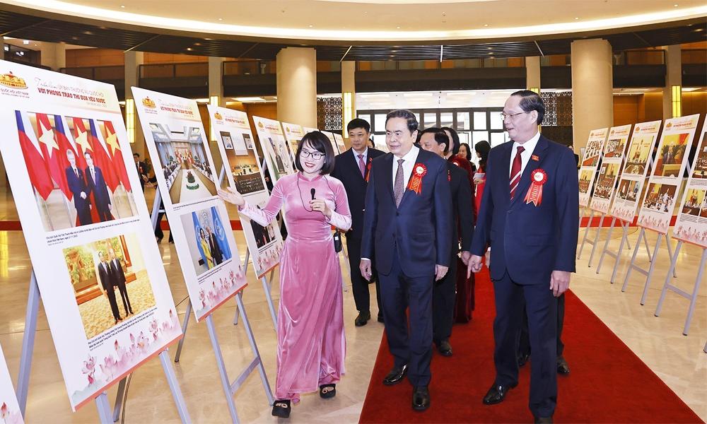 Chủ tịch Quốc hội Trần Thanh Mẫn và lãnh đạo Quốc hội xem Triển lãm Uỷ ban Thường vụ Quốc hội với phong trào thi đua yêu nước.