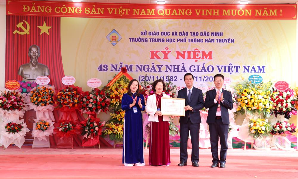 | Đồng chí Lê Xuân Lợi trao Bằng khen của Bộ Giáo dục và Đào tạo cho Trường Trung học phổ thông Hàn Thuyên. |