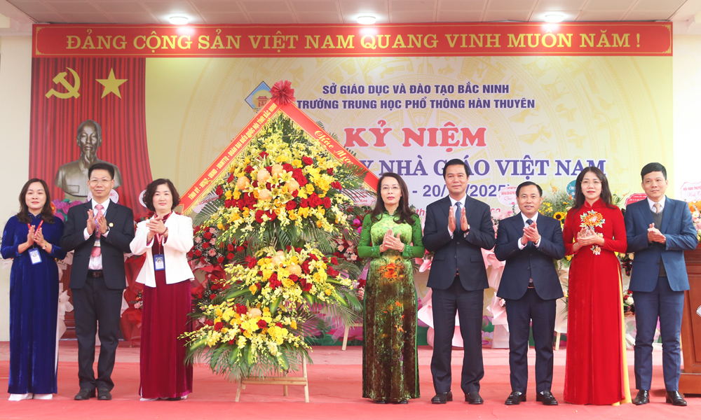Đối với học sinh, tự hào khi được học tập dưới mái trường danh nhân Hàn Thuyên, đồng chí mong các em tiếp tục nuôi dưỡng ước mơ, nỗ lực học tập và rèn luyện, đây chính là món quà ý nghĩa nhất để tri ân thầy cô và là hành trang để các em bước vào đời, góp sức xây dựng quê hương Bắc Ninh - Kinh Bắc ngày càng giàu đẹp, văn minh.