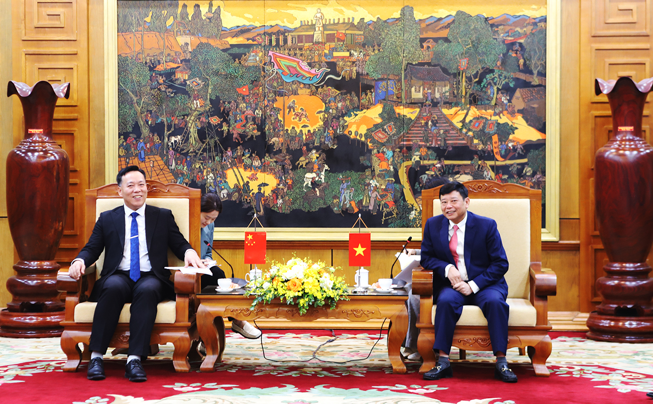 Phó Chủ tịch UBND tỉnh Ngô Tân Phượng (ảnh phải) tiếp ngài Ô Quốc Quyền, Tham tán Công sứ Đại sứ quán Trung Quốc tại Việt Nam.