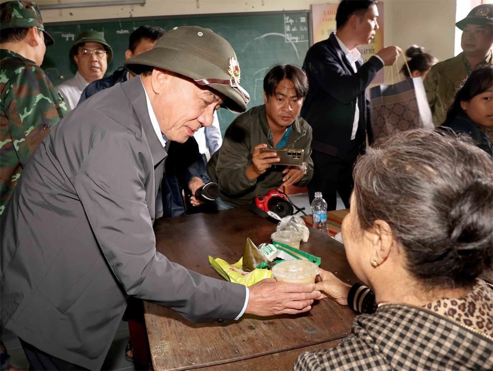 | Thường trực Ban Bí thư Trần Cẩm Tú tặng quà hỗ trợ Nhân dân xã Diên Điền, tỉnh Khánh Hoà ở nơi sơ tán. |