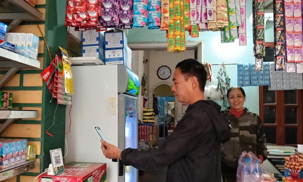| Khách hàng quét mã QR để thanh toán tại cửa hàng tạp hóa Thu Hà. |