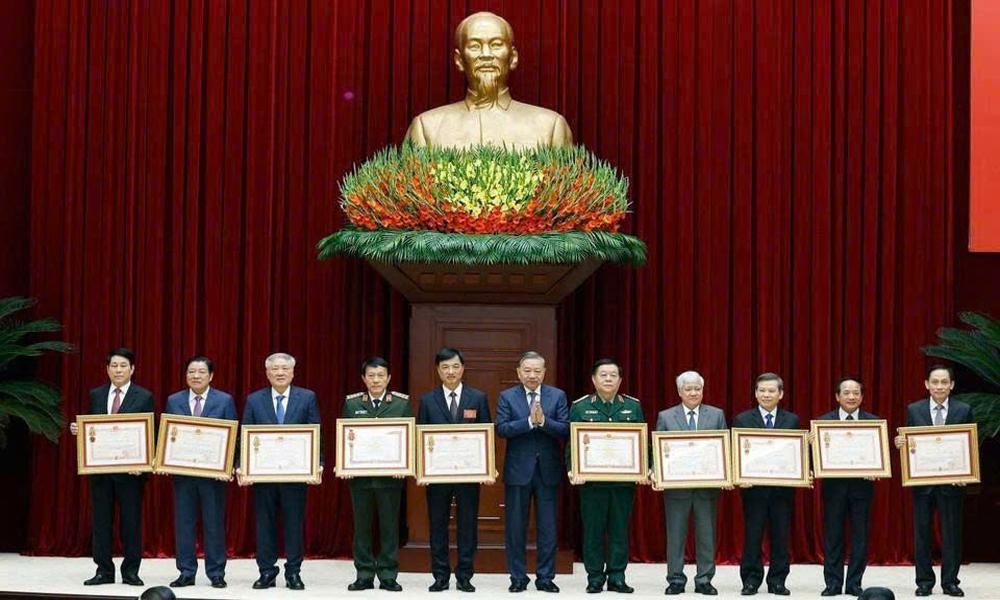 | Tổng Bí thư Tô Lâm trao tặng Huân chương Độc lập hạng Nhất, Nhì, Ba và Huân chương Quân công hạng Nhì, Ba cho các đồng chí lãnh đạo. Ảnh: TTXVN |