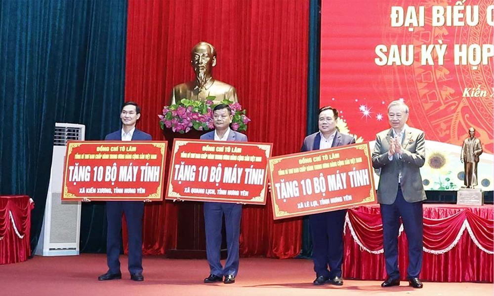 | Tổng Bí thư Tô Lâm tặng máy tính cho các xã Kiến Xương, Lê Lợi và Quang Lịch (Hưng Yên). |