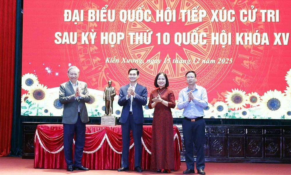 Chiều 15/12, tại Trung tâm bồi dưỡng chính trị xã Kiến Xương (tỉnh Hưng Yên), Tổng Bí thư Tô Lâm cùng các thành viên Đoàn đại biểu Quốc hội tỉnh Hưng Yên đã tiếp xúc cử tri 3 xã (Kiến Xương, Lê Lợi, Quang Lịch) thông báo kết quả Kỳ họp thứ 10, Quốc hội khóa XV và lắng nghe các ý kiến, kiến nghị của cử tri.