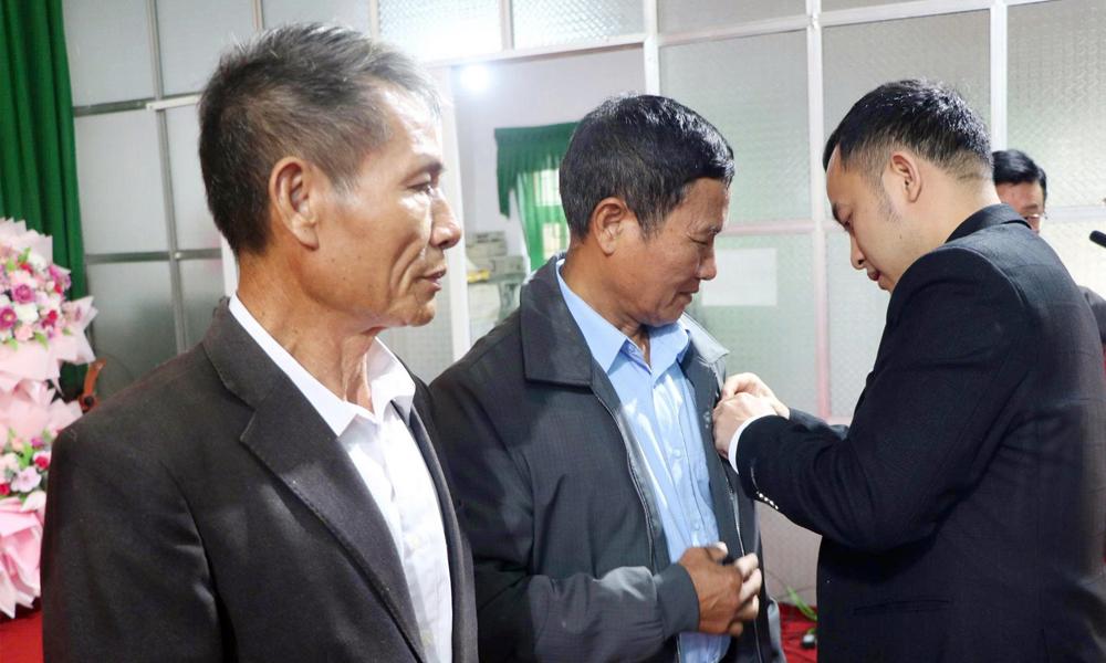 | Lãnh đạo Đảng ủy xã Tuấn Đạo gắn Huy hiệu Đảng cho đảng viên Đào Đình Diên. |