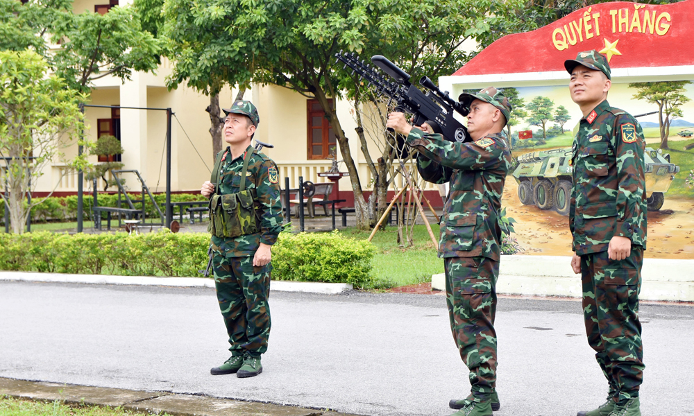 Tổ chế áp điện tử thuộc Đại đội Trinh sát - Cơ giới 1 huấn luyện chế áp phương tiện bay không người lái. |