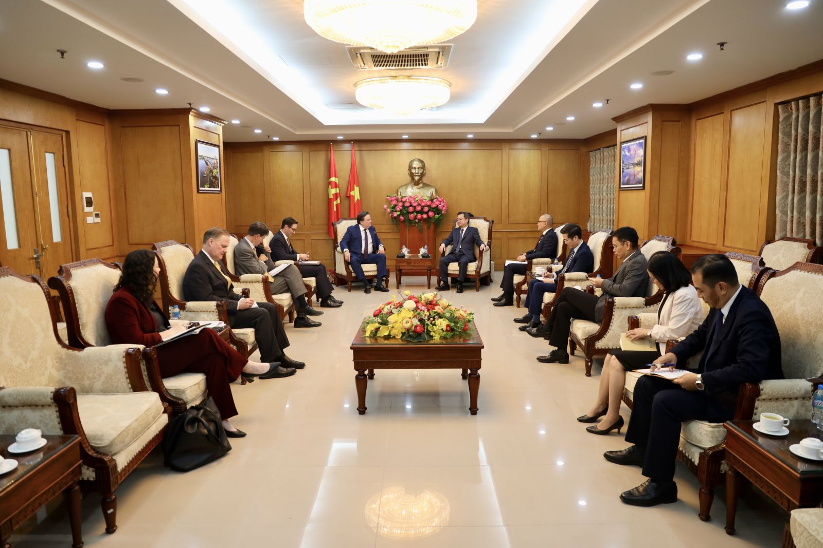 Đồng chí Nguyễn Thanh Nghị chào mừng Đại sứ Marc Knapper đến làm việc với Ban Chính sách, chiến lược Trung ương trong bối cảnh quan hệ Đối tác chiến lược toàn diện giữa Việt Nam và Hoa Kỳ đang trong giai đoạn phát triển tốt đẹp nhất từ trước đến nay. Sau 30 năm, quan hệ hợp tác giữa hai nước ngày càng phát triển sâu rộng, toàn diện trên tất cả các lĩnh vực, trong đó hợp tác về kinh tế - thương mại, đầu tư đã trở thành một trụ cột quan trọng. Kim ngạch thương mại hai chiều đã tăng trưởng khoảng 300 lầnkể từ năm 1995, từ 500 triệu USD năm 1994 lên mức 150 tỷ USD năm 2024. Hoa Kỳ là thị trường xuất khẩu lớn nhất của Việt Nam và Việt Nam là đối tác thương mại lớn nhất ở khu vực ASEAN, lớn thứ 8trên toàn cầu của Hoa Kỳ. Mỹ là nhà đầu tư nước ngoài lớn thứ 11 tại Việt Nam với khoảng 1.409 dự án đầu tư có tổng vốn trên 11,9 tỷ USD (tính đến hết 2024). Đã có hơn 60 tập đoàn, doanh nghiệp lớn của Hoa Kỳ đã có hiện diện và hoạt động đầu tư – kinh doanh tại Việt Nam trong nhiều ngành nghề, lĩnh vực, tập trung vào lĩnh vực công nghệ, sản xuất, năng lượng tái tạo và logistics. Đồng chí nhấn mạnh, Việt Nam luôn coi Hoa Kỳ là đối tác có tầm quan trọng chiến lược hàng đầu và mong muốn cùng với Hoa Kỳ tiếp tục triển khai quan hệ theo hướng ngày càng thực chất hơn, đi vào chiều sâu, vì lợi ích của nhân dân hai nước. Đồng chí Trưởng Ban cho biết, Ban Chính sách, chiến lược Trung ương là cơ quan tham mưu, giúp việc của Ban Chấp hành Trung ương Đảng, trực tiếp và thường xuyên là Bộ Chính trị, Ban Bí thư trong việc lãnh đạo, chỉ đạo về phát triển kinh tế - xã hội; định hướng xây dựng và hoàn thiện thể chế kinh tế, hoạch định đường lối, chủ trương, chính sách, chiến lược, biện pháp lớn, quan trọng về kinh tế - xã hội. Do đó Ban mong muốn lắng nghe ý kiến trao đổi, khuyến nghị của Đại sứ để tăng cường mối quan hệ hợp tác giữa hai nước.
