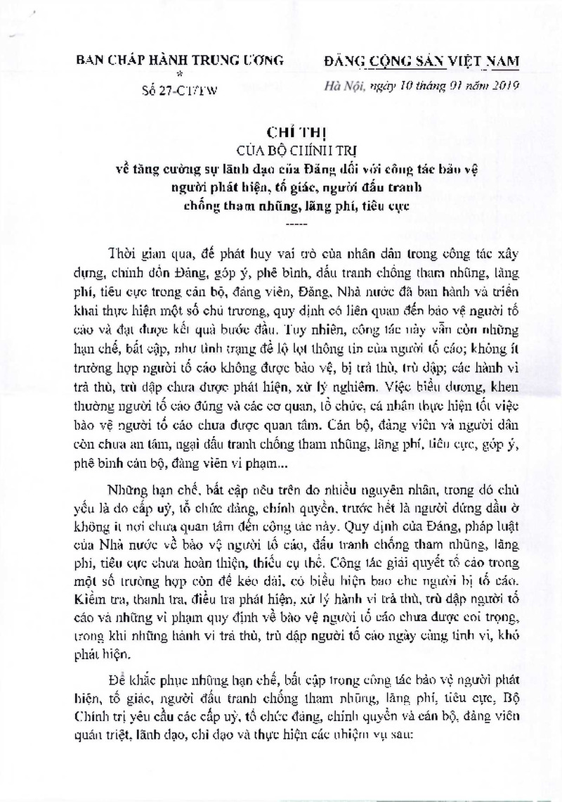 Chỉ thị số 27-CT/TW ngày 10-01-2019 của Bộ Chính trị về tăng cường sự lãnh đạo của Đảng đối với công tác bảo vệ người phát hiện, tố giác, người đấu tranh chống tham nhũng, lãng phí, tiêu cực