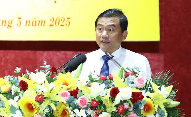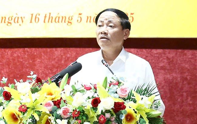Đồng chí Nguyễn Xuân Vĩnh, Bí thư Huyện ủy An Lão phát biểu về công tác xóa nhà tạm, nhà dột nát trên địa bàn huyện, đảm bảo an sinh xã hội, vươn lên thoát khỏi huyện nghèo vào năm 2025. Ảnh: NGUYỄN DŨNG.