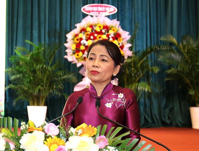 Đồng chí Nguyễn Thị Phong Vũ, Ủy viên Ban Thường vụ Tỉnh ủy, Trưởng Ban Tuyên giáo và Dân vận Tỉnh ủy, trình bày tham luận về những đóng góp của Đảng bộ và nhân dân Bình Định trong 300 ngày hoàn thành việc chuyển quân tập kết ra Bắc tại Quy Nhơn. Ảnh: H.THU