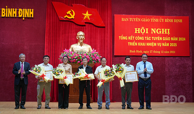 Ban Tuyên giáo Tỉnh ủy khen thưởng các tập thể có thành tích xuất sắc trong công tác tuyên giáo năm 2024 tại Hội nghị triển khai công tác tuyên giáo năm 2025. Ảnh: N. HÂN