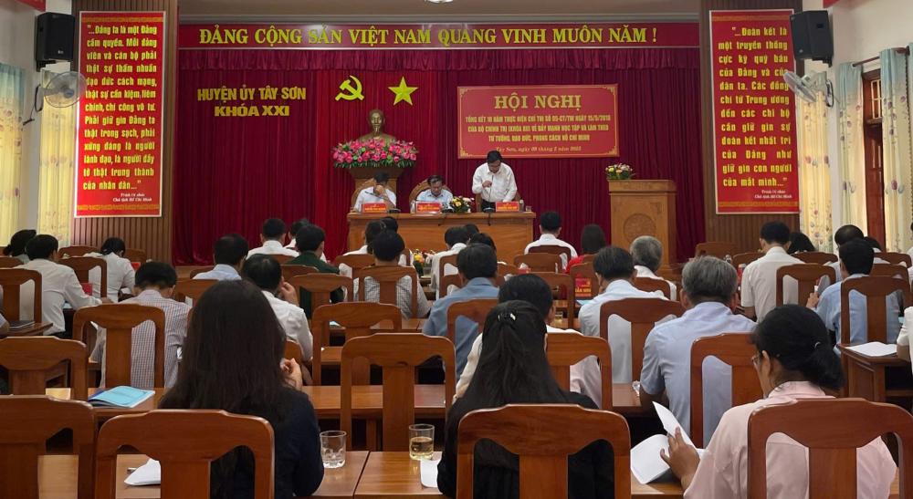 Theo báo cáo, qua 10 năm triển khai thực hiện Chỉ thị số 05-CT/TW, Huyện ủy Tây Sơn đã xây dựng, ban hành 48 văn bản để lãnh đạo, chỉ đạo hệ thống chính trị và các tổ chức cơ sở đảng trong toàn huyện; các tổ chức cơ sở đảng xây dựng và ban hành 667 văn bản để triển khai thực hiện gắn với việc thực hiện nhiệm vụ chính trị, phù hợp với điều kiện và đặc điểm của địa phương, cơ quan, đơn vị. Toàn huyện đã tổ chức 326 hội nghị học tập, nghiên cứu, quán triệt Chỉ thị số 05-CT/TW, Kết luận số 01-KL/TW và các chuyên đề học tập và làm theo tư tưởng, đạo đức, phong cách Hồ Chí Minh hàng năm, toàn khóa cho 47.748 lượt cán bộ, đảng viên. Hằng năm, 100% tổ chức đảng xây dựng kế hoạch và hơn 95% cán bộ, đảng viên, công chức, viên chức người lao động trong các cơ quan, đơn vị xây dựng cam kết tu dưỡng rèn luyện. Hoạt động tuyên truyền trực quan từ huyện đến cơ sở được ngành chức năng và các chi, đảng bộ chú trọng thực hiện: Chiếu 136 bộ phim, video; tuyên truyền trực quan 1.735 pa nô, 847 băng rôn, 128 khẩu hiệu, 187 sự kiện, chương trình (trong đó có 91 hoạt động thể dục thể thao, 39 chương trình văn nghệ; tổ chức 57 hội thi "Kể chuyện Bác Hồ") .... Công tác biểu dương, khen thưởng, tôn vinh các tập thể, cá nhân có thành tích xuất sắc trong học tập và làm theo tư tưởng, đạo đức, phong cách Hồ Chí Minh được các cấp, các địa phương, cơ quan, đơn vị trong huyện quan tâm thực hiện; Ủy ban nhân dân huyện khen thưởng 35 tập thể và 58 cá nhân; chính quyền cơ sở khen thưởng cho 136 tập thể và 249 cá nhân tiêu biểu. Qua thực hiện đã xuất hiện nhiều cách làm hay, sáng tạo, có sức lan tỏa, từ đó, làm chuyển biến mạnh mẽ về nhận thức và hành động, tác phong, thái độ, trách nhiệm và văn hóa ứng xử của đảng viên, cán bộ trong thực hiện nhiệm vụ chính trị, đề ra những giải pháp thiết thực, giải quyết được nhiều vấn đề nổi cộm, bức xúc, tồn đọng nhiều năm như: Công tác bồi thường, giải phóng mặt bằng; công tác quản lý đất đai, bảo vệ tài nguyên, khoáng sản và môi trường; cải cách thủ tục hành chính; xóa bỏ lò gạch thủ công, ...góp phần đưa việc học tập và làm theo tư tưởng, đạo đức, phong cách Hồ Chí Minh đi vào cuộc sống.