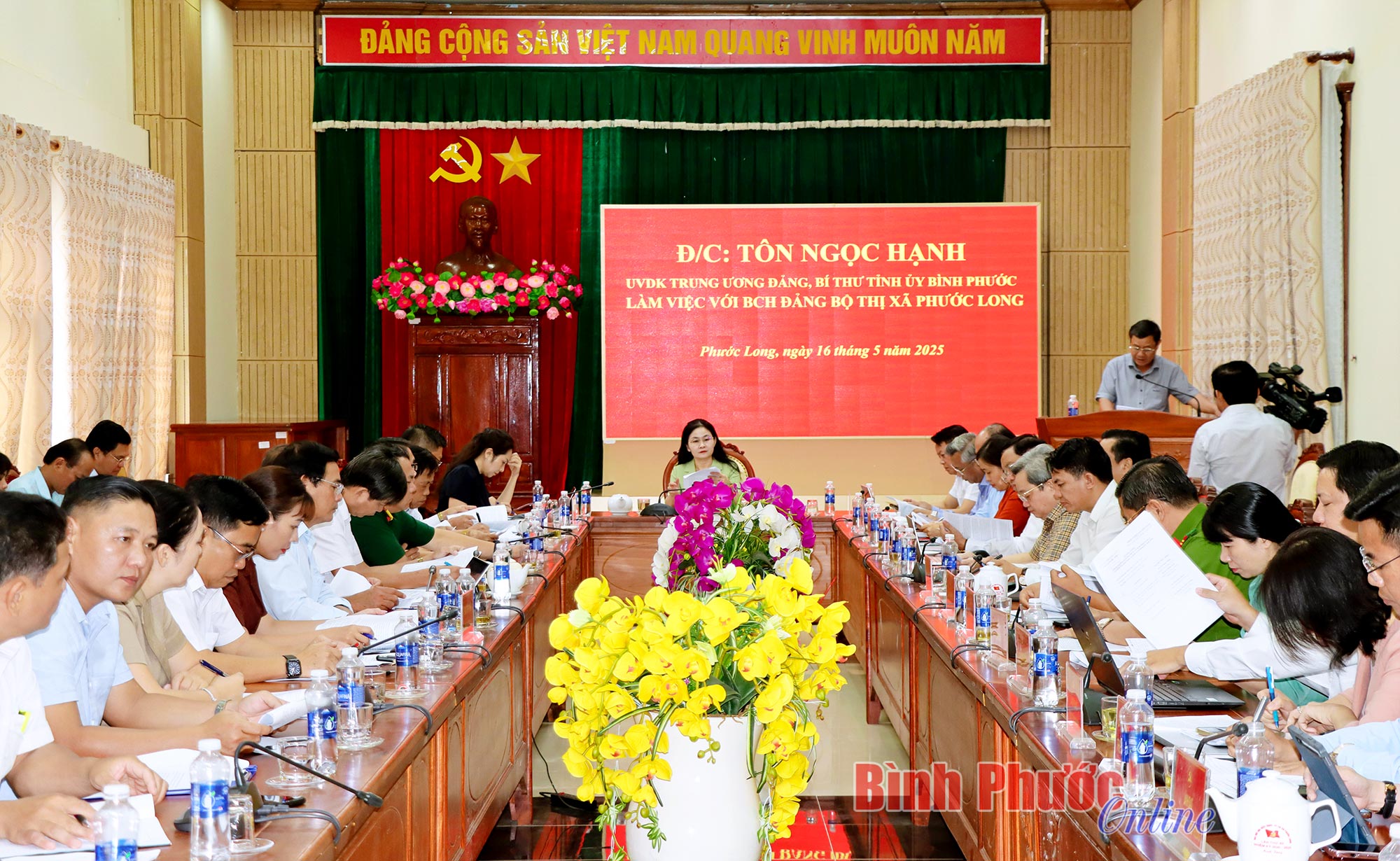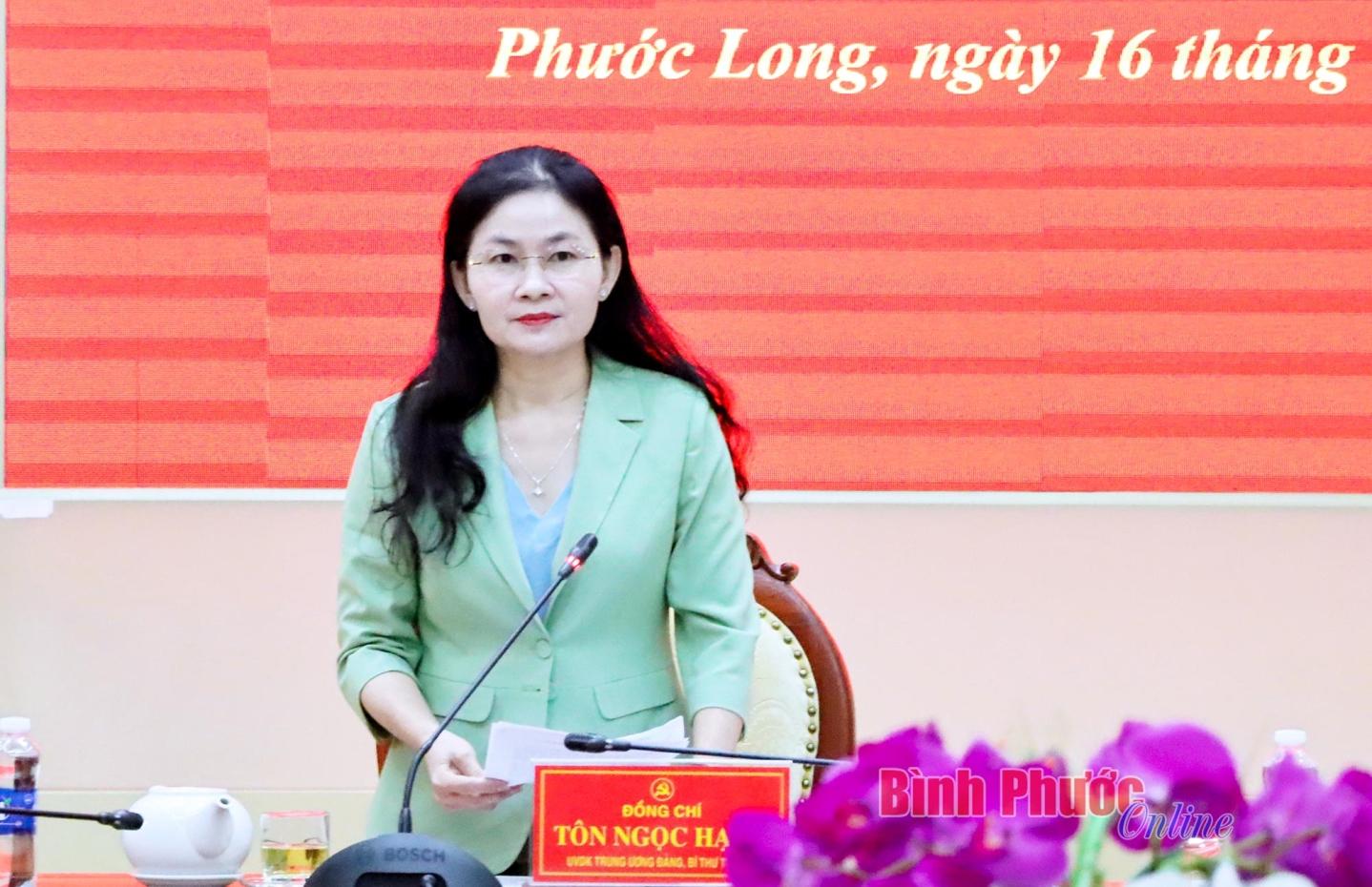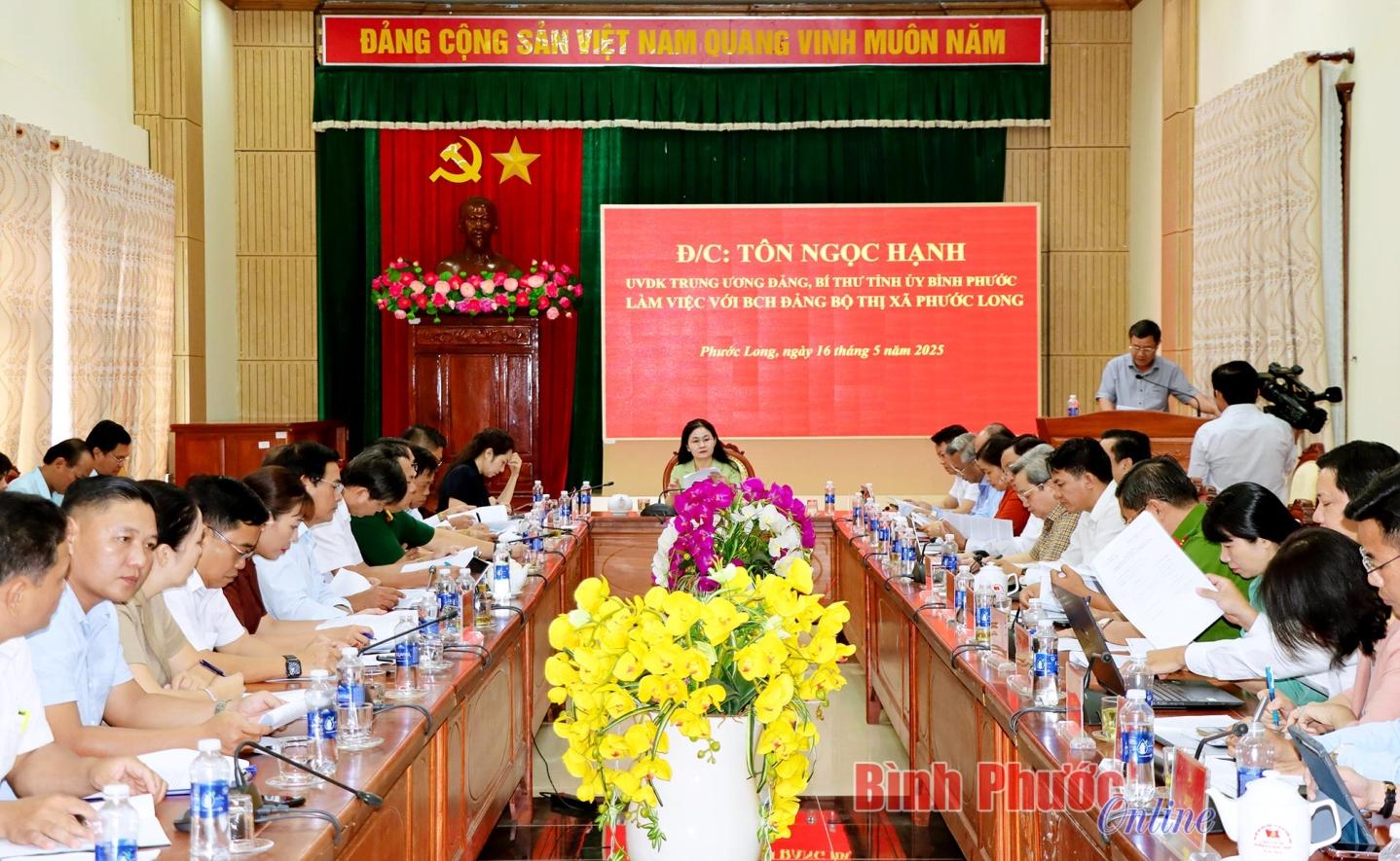 Phát biểu tại buổi làm việc, Bí thư Tỉnh ủy Tôn Ngọc Hạnh biểu dương những kết quả mà Đảng bộ, chính quyền và nhân dân thị xã Phước Long đạt được trong thời gian qua. Đồng thời lưu ý thị xã cần quan tâm công tác xây dựng Đảng, nhất là phát huy vai trò nêu gương của cán bộ, đảng viên trong nhiệm vụ được giao; tăng cường đối thoại, lắng nghe ý kiến nhân dân để kịp thời giải quyết các vướng mắc, tạo sự đồng thuận để đẩy nhanh các dự án, công trình phục vụ phát triển kinh tế - xã hội của địa phương.