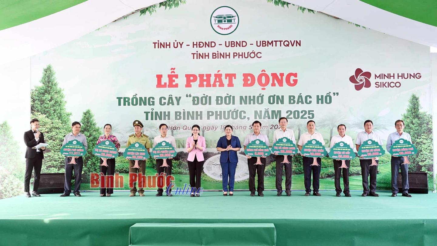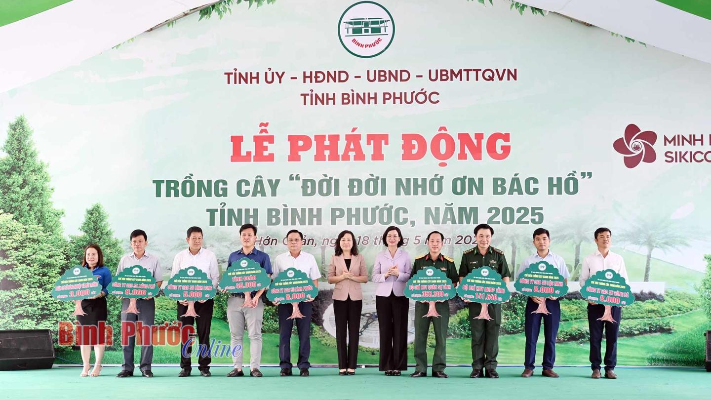 Dịp này, UBND tỉnh cũng đã trao bảng giao chỉ tiêu trồng cây xanh năm 2025 cho các 11 huyện, thị xã, thành phố và 9 cơ quan, đơn vị, doanh nghiệp trên địa bàn tỉnh. Đồng thời, thực hiện nghi thức bấm chuông, phát động phong trào “Trồng cây đời đời nhớ ơn Bác Hồ” tỉnh Bình Phước năm 2025.
