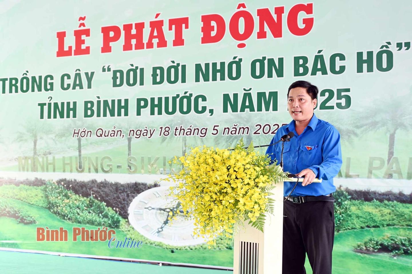 Anh Lê Văn Quý, Bí thư Huyện đoàn Hớn Quản, đại diện thế hệ trẻ phát biểu hưởng ứng phong trào “Trồng cây đời đời nhớ ơn Bác Hồ” năm 2025