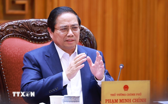 Thủ tướng Phạm Minh Chính chủ trì cuộc họp về dự thảo phát triển giáo dục, đào tạo và chăm sóc sức khoẻ nhân dân. (Ảnh: Dương Giang/TTXVN)