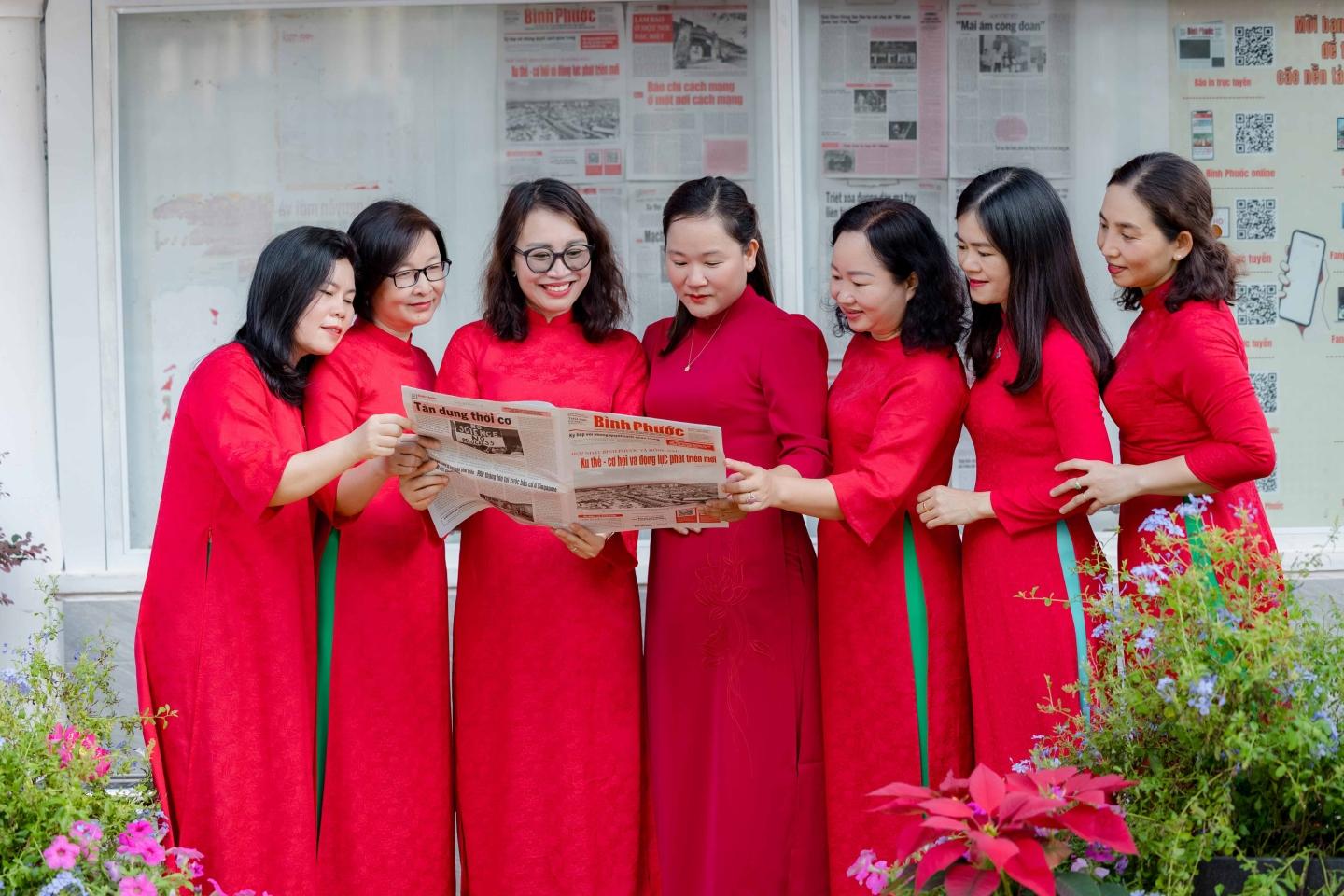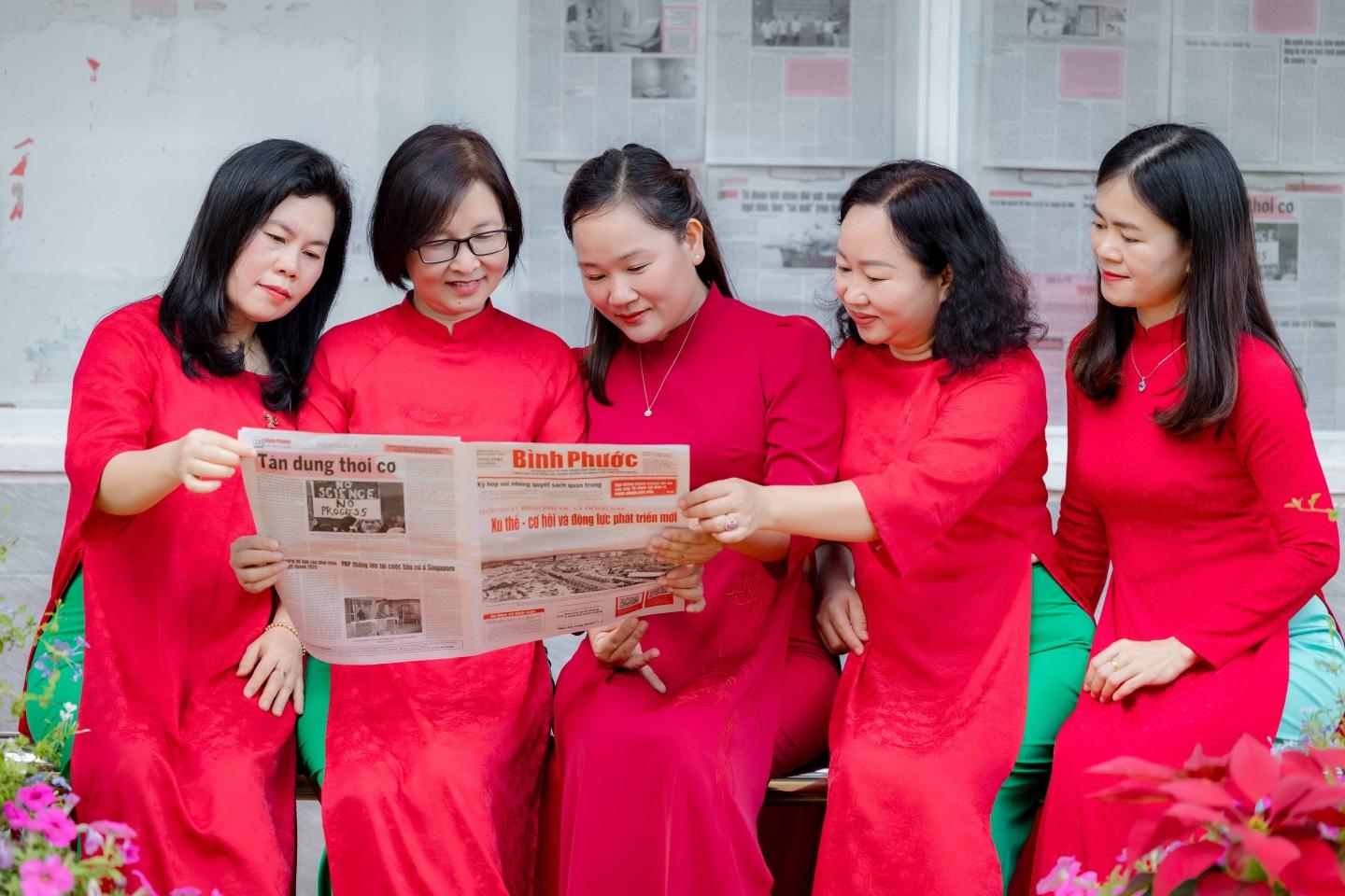 Cán bộ, viên chức BPTV chụp hình lưu niệm tại không gian đọc báo của cơ quan