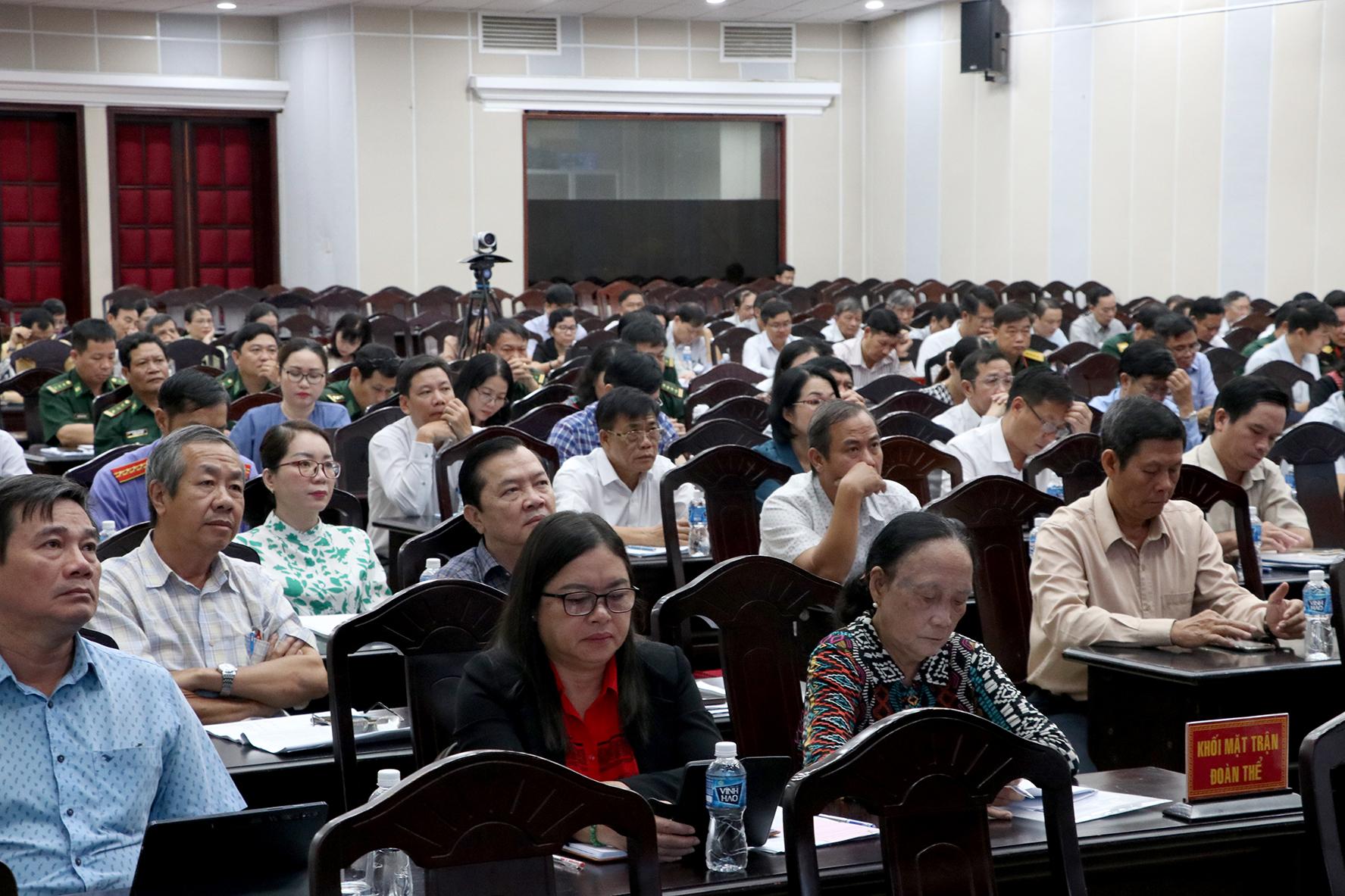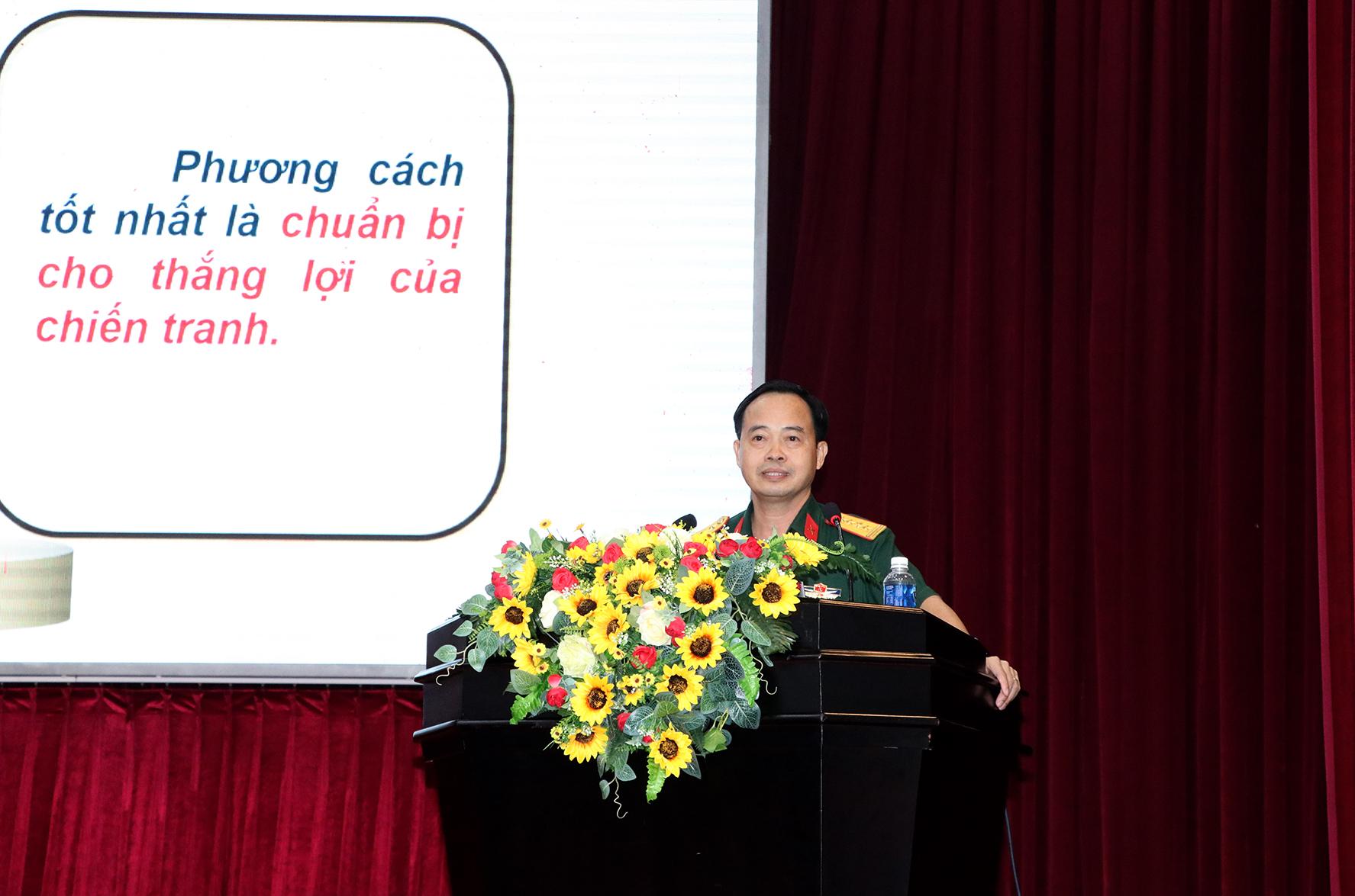 Truyền đạt chuyên đề về chiến lược bảo vệ Tổ quốc trong tình hình mới Đại tá Nguyễn Tiến Sơn - Chủ nhiệm Chính trị, Trường Quân sự Quân khu VII nêu 3 nội dung chính: Những vấn đề chung; một số nguy cơ, thách thức và vấn đề đặt ra đối với chiến lược bảo vệ Tổ quốc trong tình hình mới; giải pháp và gợi ý cho địa phương trong thực hiện nhiệm vụ bảo vệ Tổ quốc trong tình hình mới.