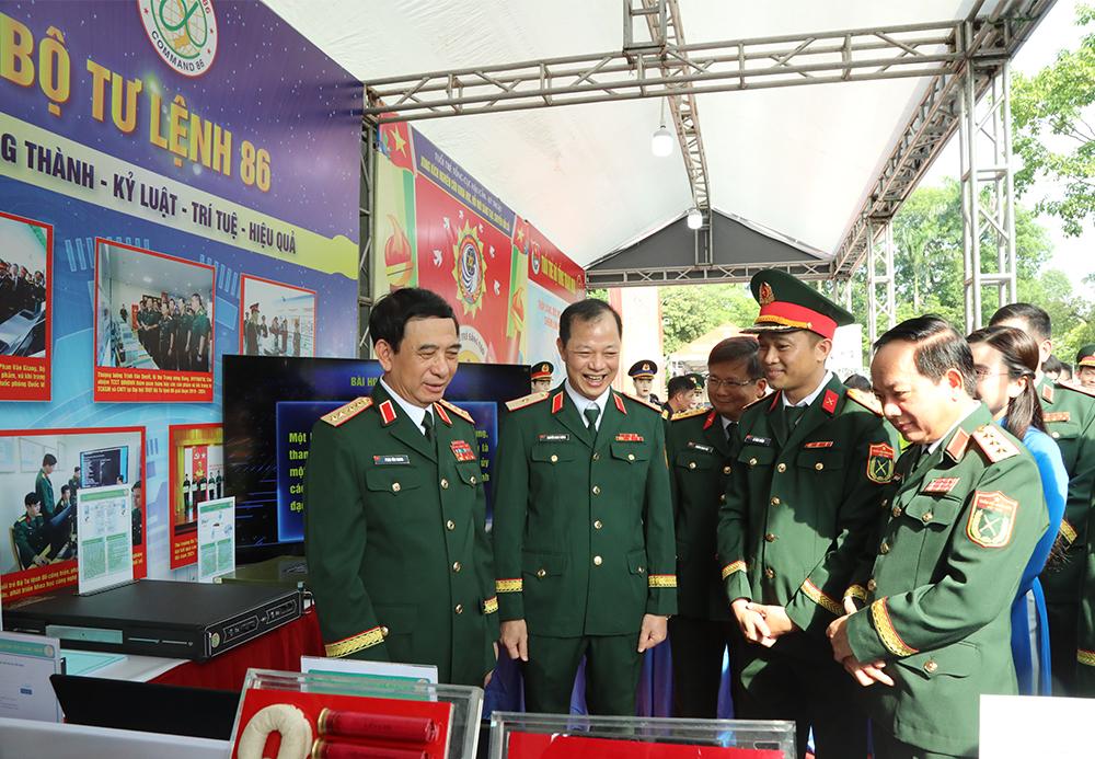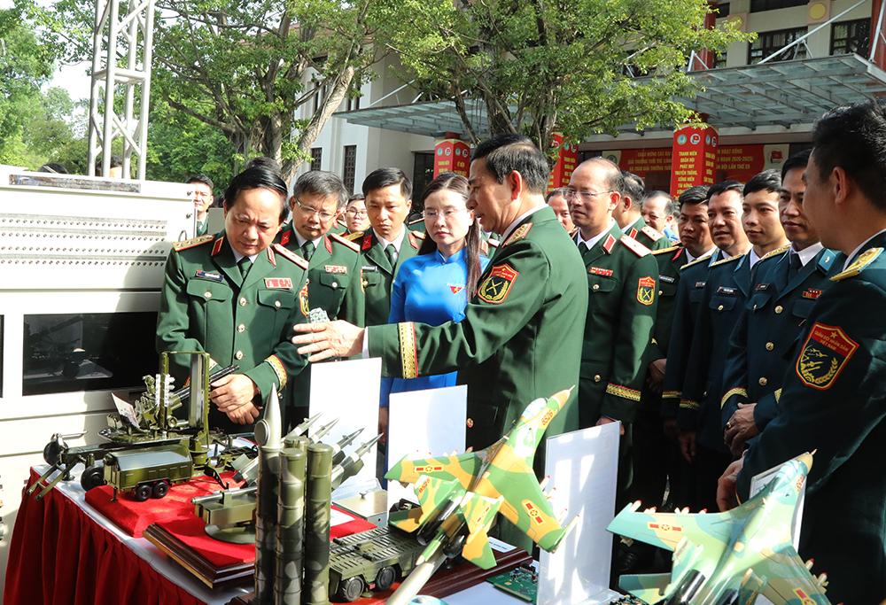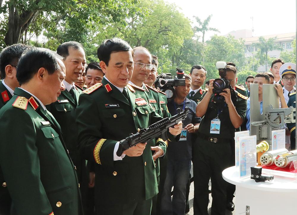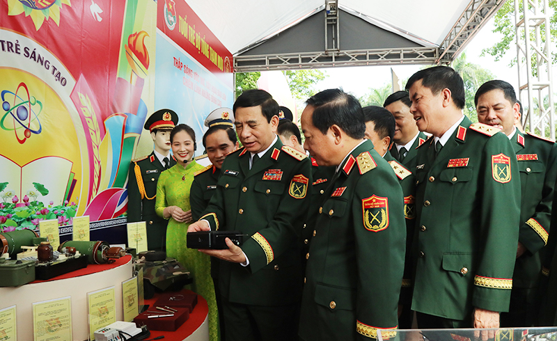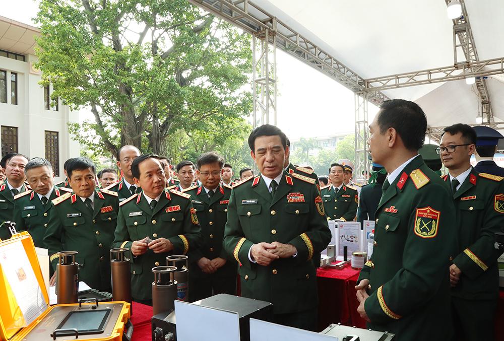 Đại tướng Phan Văn Giang và các đại biểu thăm quan khu trưng bày sản phẩm nghiên cứu khoa học của tuổi trẻ Quân đội tại buổi lễ.