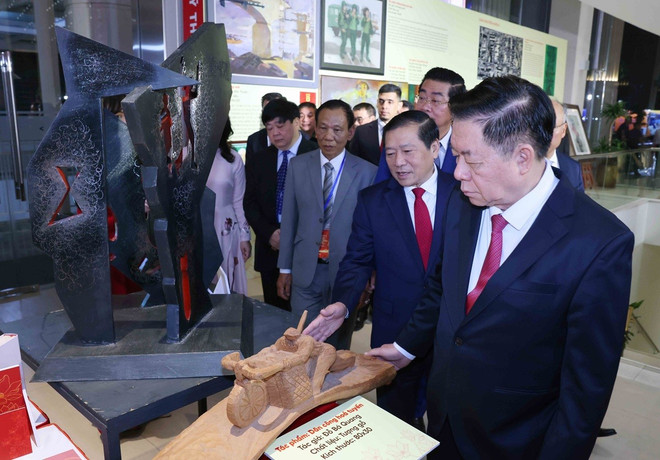 Trưởng Ban Tuyên giáo và Dân vận Trung ương Nguyễn Trọng nghĩa tham quan trưng bày các tác phẩm đạt giải. (Ảnh: Phương Hoa/TTXVN)