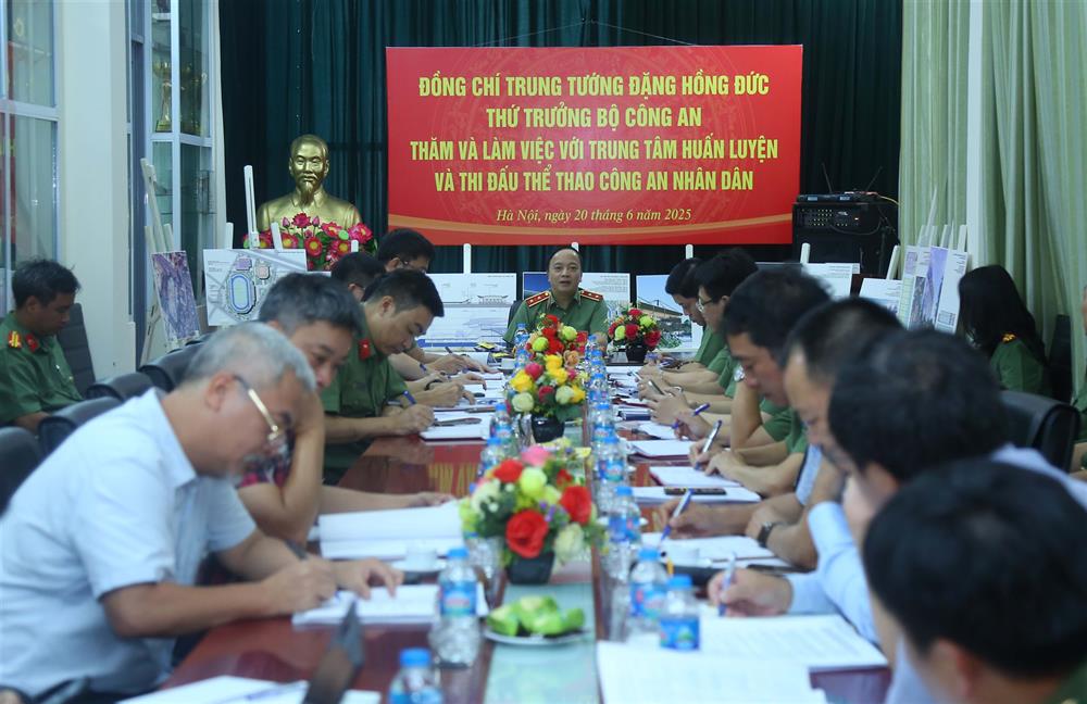 Tại buổi làm việc, sau khi nghe lãnh đạo Trung tâm huấn luyện và thi đấu thể thao Công an nhân dân báo cáo về tiến độ thi công nâng cấp các hạng mục tại Trung tâm huấn luyện và thi đấu thể thao Công an nhân dân, Thứ trưởng Đặng Hồng Đức đề nghị Trung tâm huấn luyện và thi đấu thể thao Công an nhân dân chủ động phối hợp với các đơn vị liên quan tập trung đánh giá tiến độ đối với các hạng mục như: thiết kế, thi công, phương án tổng thể và chi tiết… nhằm đảm bảo công trình sau khi hoàn thành vừa đạt chất lượng cao lại có tính thẩm mỹ và sử dụng lâu dài phục vụ có hiệu quả cho công tác huấn luyện và thi đấu thể thao trong toàn lực lượng.