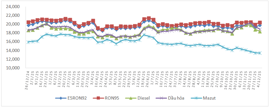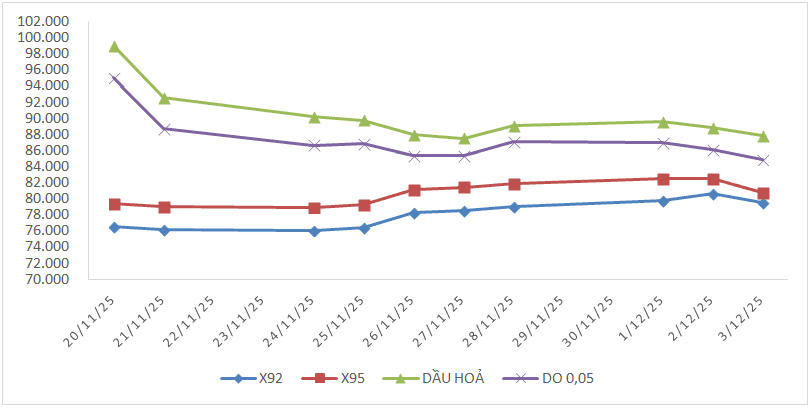 Bình quân giá thành phẩm xăng dầu thế giới giữa kỳ điều hành giá ngày 27/11/2025 và kỳ điều hành ngày 04/12/2025 là: 79,510 USD/thùng xăng RON92 dùng để pha chế xăng E5RON92 (tăng 2,814 USD/thùng, tương đương tăng 3,67%); 81,832 USD/thùng xăng RON95 (tăng 2,276 USD/thùng, tương đương tăng 2,86%); 88,582 USD/thùng dầu hỏa (giảm 3,324 USD/thùng, tương đương giảm 3,62%); 86,098 USD/thùng dầu điêzen 0,05S (giảm 2,416 USD/thùng, tương đương giảm 2,73%); 344,576 USD/tấn dầu mazut 180CST 3,5S (giảm 2,004 USD/tấn, tương đương giảm 0,58%).