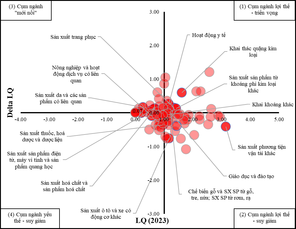 + Nhóm ngành mới nổi: Các ngành có giá trị LQ < 1, tuy nhiên có xu hướng tăng dần theo thời gian (∆LQ > 0), được coi là các ngành “yếu đang phát triển” và có tiềm năng phát triển trong tương lai.