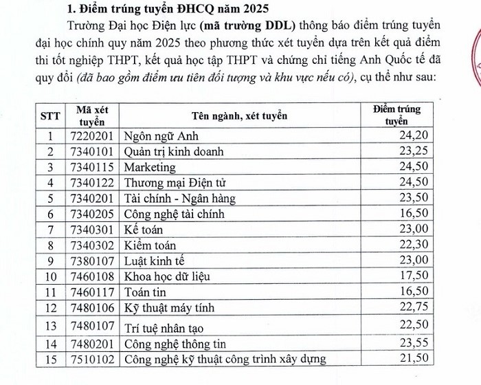 Trường Đại học Điện lực công bố điểm chuẩn đại học năm 2025