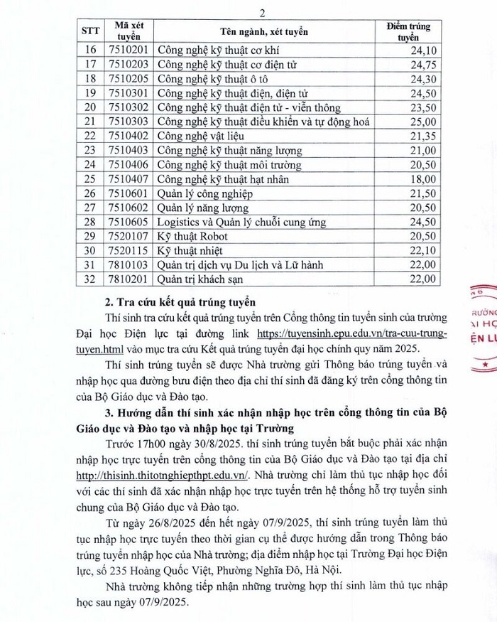 Thí sinh trúng tuyển sẽ được trường Đại học Điện lực gửi thông báo trúng tuyển và nhập học qua đường bưu điện theo địa chỉ thí sinh đã đăng ký trên cổng thông tin của Bộ GD&ĐT.