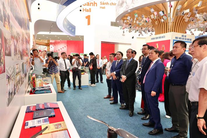 Bộ trưởng Nguyễn Kim Sơn và Thứ trưởng Lê Tấn Dũng tham quan gian trưng bày