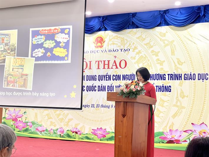Tại hội thảo, TS Nguyễn Thị Quý, Vụ Giáo dục Phổ thông, trình bày báo cáo kết quả việc thực hiện Quyết định số 1309/QĐ-TTg phê duyệt “Đề án đưa nội dung quyền con người vào chương trình giáo dục trong hệ thống giáo dục quốc dân” ở Việt Nam.