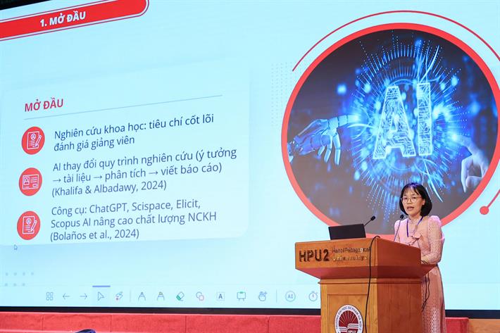 Phát biểu tại hội nghị, ThS. Cao Hồng Huệ, Phó Giám đốc Trung tâm Truyền thông và Sản xuất học liệu, Trường ĐHSP Hà Nội 2, cho biết AI đang thay đổi toàn bộ quy trình nghiên cứu khoa học, từ ý tưởng, thu thập tài liệu, phân tích đến viết báo cáo. Khảo sát cho thấy 83% giảng viên đánh giá AI cần thiết, nhưng chỉ 15,1% tự tin ứng dụng.