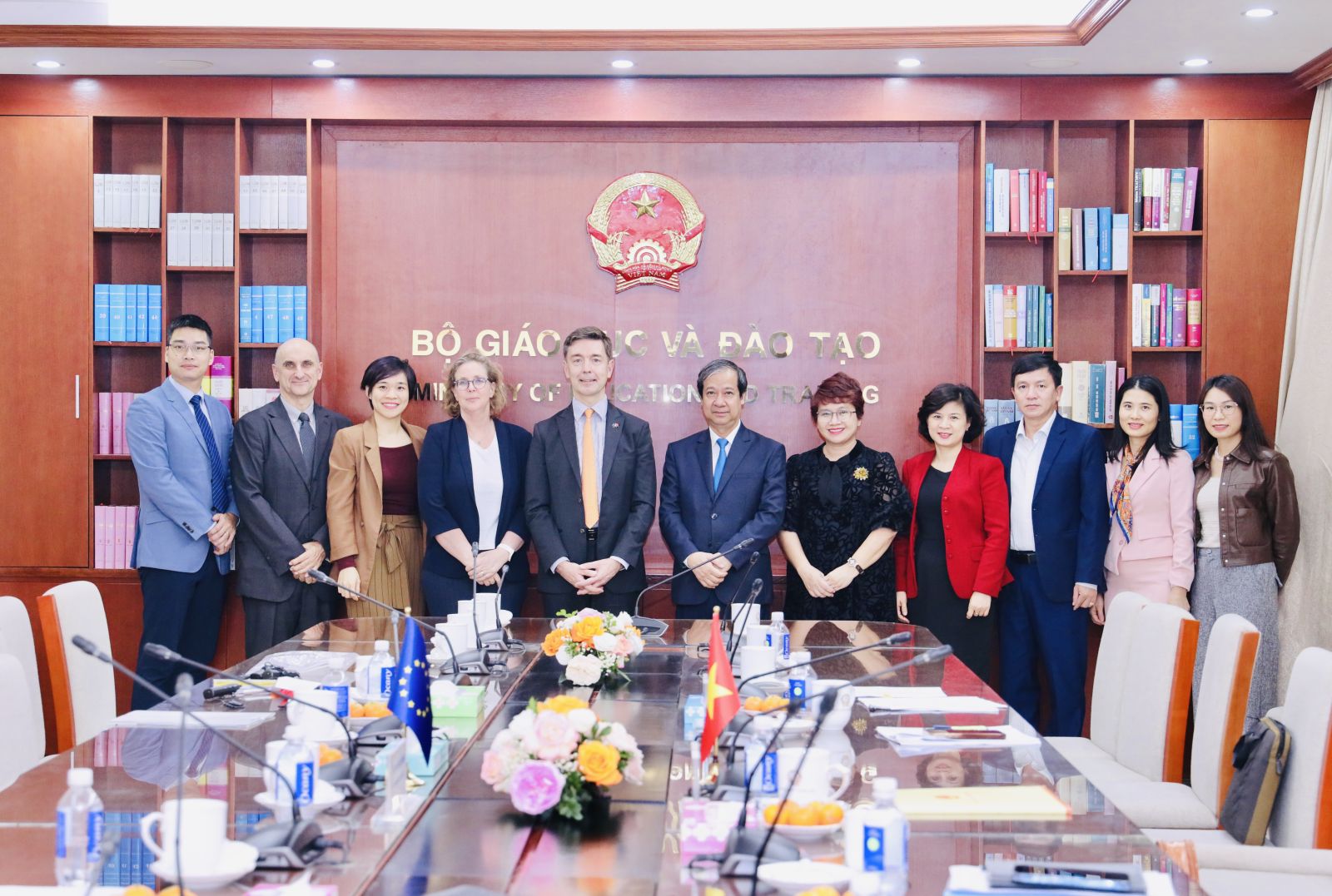 Các đại biểu đại diện Bộ GDĐT và đại diện Liên minh Châu Âu (EU) tại Việt Nam cùng chụp hình lưu niệm