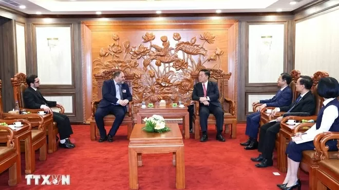 | Trưởng Ban Tuyên giáo và Dân vận Trung ương Nguyễn Trọng Nghĩa và đồng chí Guillermo Rehermann Armesto, Ủy viên Bộ Chính trị, Bí thư Trung ương phụ trách tổ chức và chính sách cán bộ Đảng Cộng sản Uruguay tại buổi tiếp. |