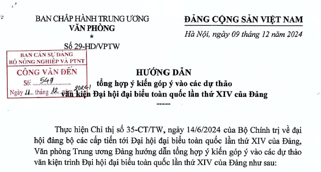 Hướng dẫn số 29-HD/VPTW ngày 09/12/2024 của Văn phòng Trung ương Đảng về việc tổng hợp ý kiến góp ý vào các dự thảo văn kiện Đại hội đại biểu toàn quốc lần thứ XIV của Đảng