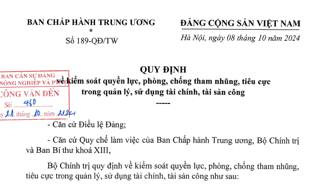 Quy định số 189-QĐ/TW ngày 08/10/2024 của Bộ Chính trị quy định về kiểm soát quyền lực, phòng, chống tham nhũng, tiêu cực trong quản lý, sử dụng tài chính, tài sản công.
