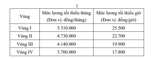 Quy định các mức lương tối thiểu tháng theo 4 vùng: vùng I là 5.310.000 đồng/tháng; vùng II là 4.730.000 đồng/tháng; vùng III là 4.140.000 đồng/tháng; vùng IV là 3.700.000 đồng/tháng.
