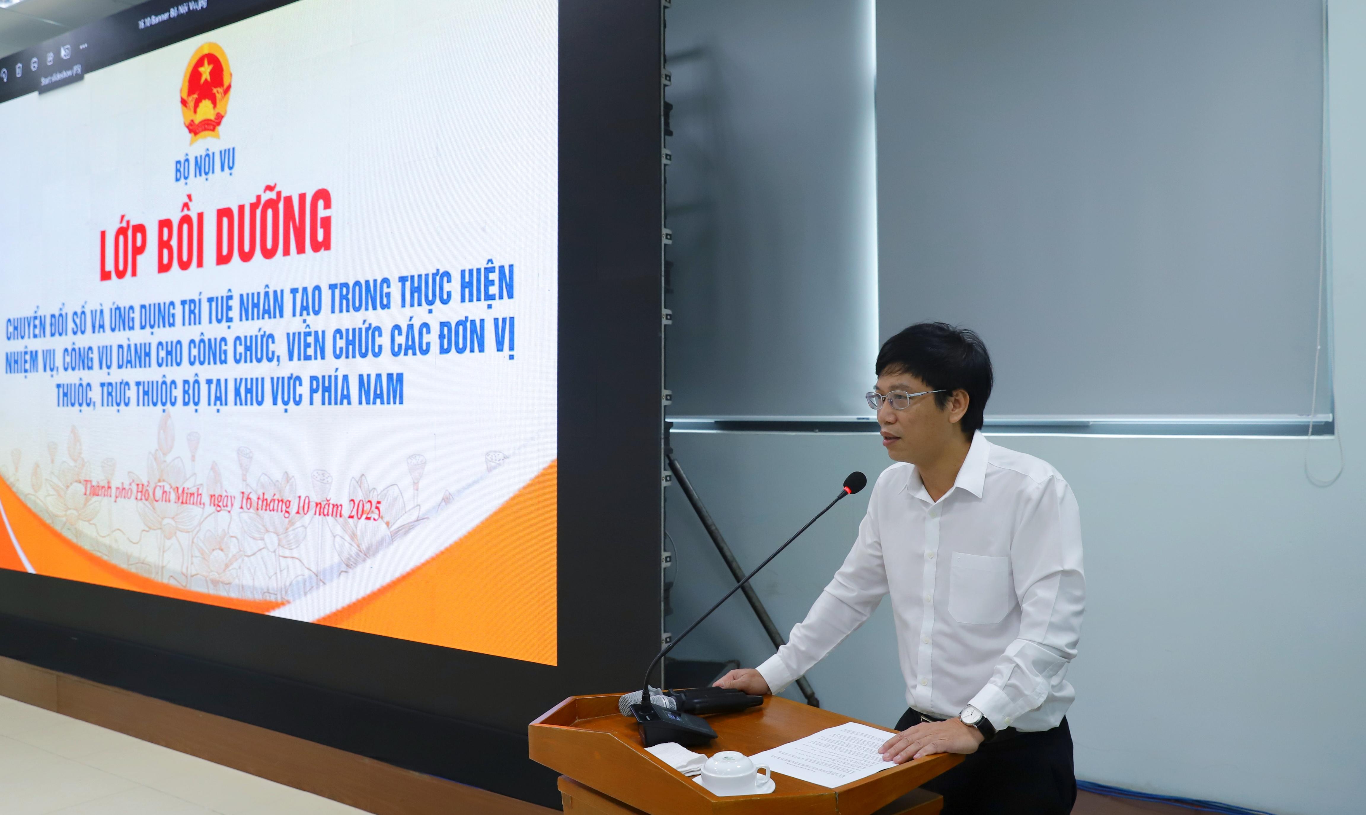 Phát biểu khai mạc Lớp bồi dưỡng, ông Lê Đạt - Phó Vụ trưởng Vụ Tổ chức cán bộ Bộ Nội vụ chia sẻ, lắng nghe nguyện vọng của đội ngũ công chức, viên chức, ngày 23/9/2025, Bộ trưởng Bộ Nội vụ đã có Quyết định số 1092/QĐ-BNV về việc bổ sung lớp bồi dưỡng chuyển đổi số và ứng dụng trí tuệ nhân tạo trong thực hiện nhiệm vụ, công vụ dành cho công chức, viên chức các đơn vị thuộc, trực thuộc Bộ tại khu vực phía Nam.