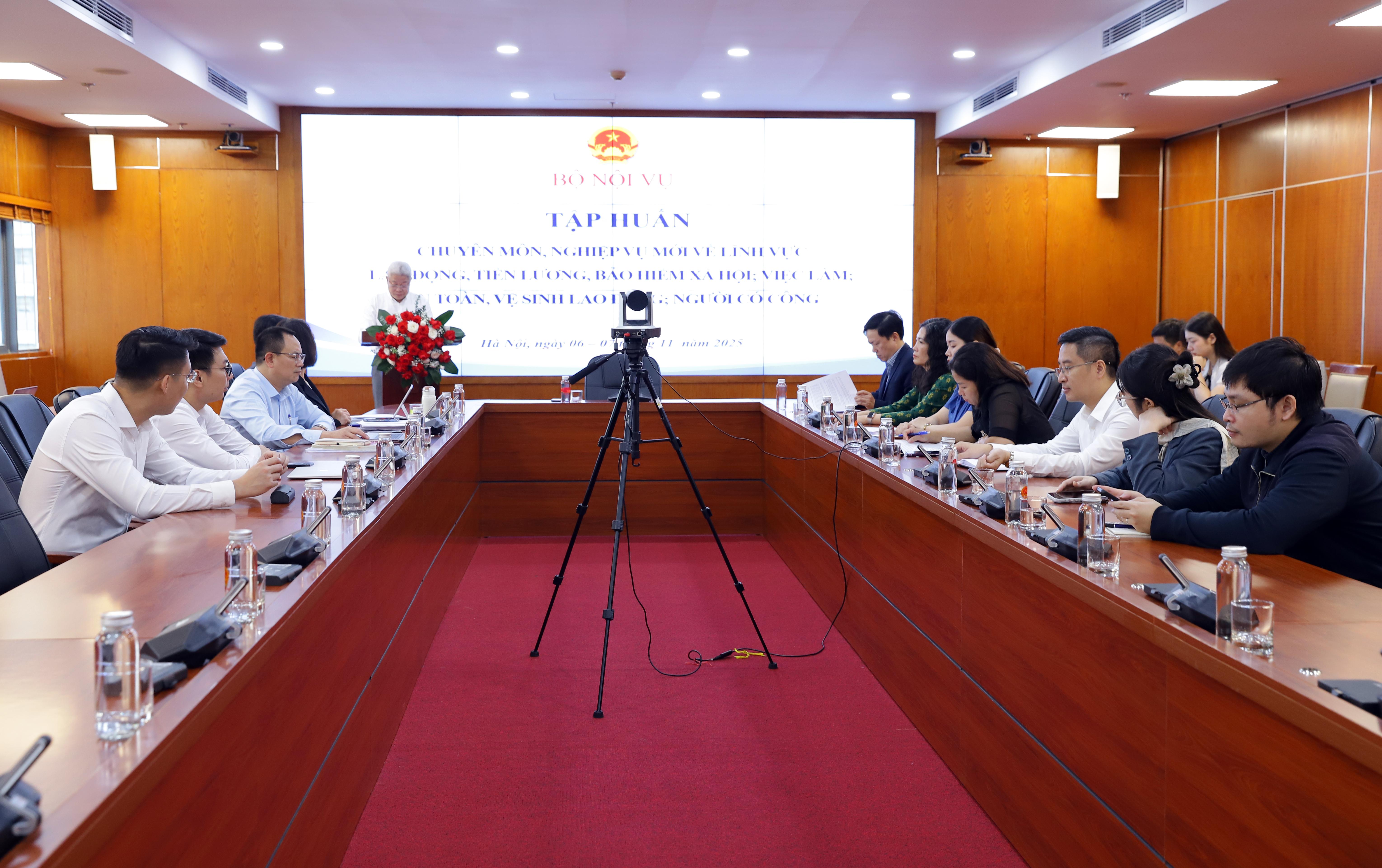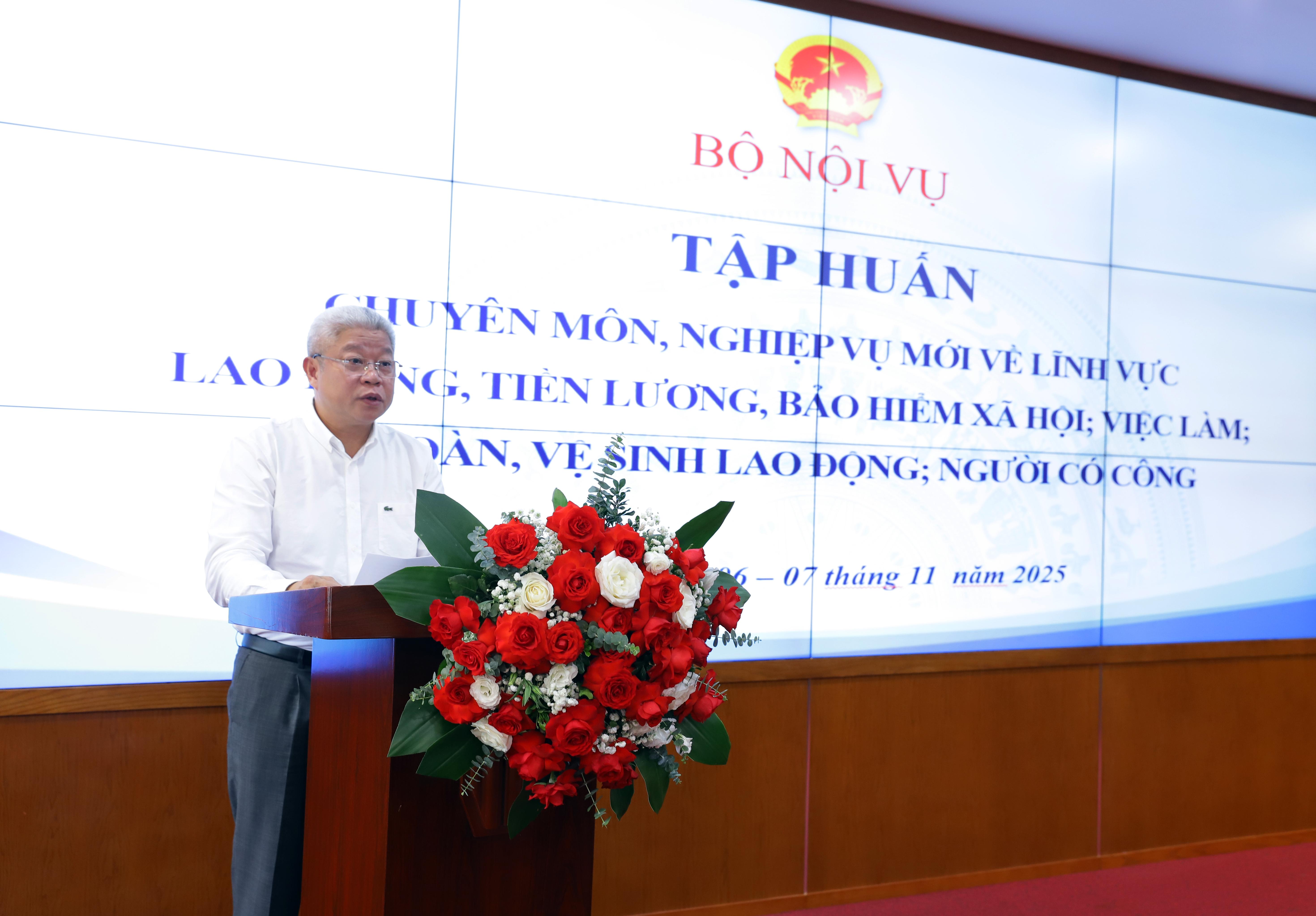 Trong hai ngày, từ ngày 06/11 – 07/11/2025, Bộ Nội vụ tổ chức Hội nghị tập huấn chuyên môn, nghiệp vụ mới lĩnh vực về lĩnh vực lao động, tiền lương, bảo hiểm xã hội; việc làm; an toàn, vệ sinh lao động; người có công theo hình thức trực tuyến tới toàn thể các cán bộ, công chức, viên chức xã, phường, đặc khu trực thuộc cấp tỉnh, thành phố trực thuộc Trung ương. Thứ trưởng Bộ Nội vụ Nguyễn Mạnh Khương tới dự và có bài phát biểu khai mạc Hội nghị tập huấn.