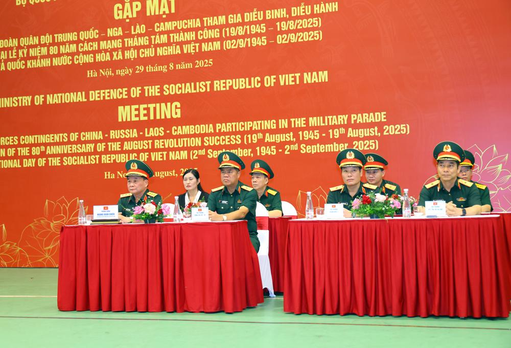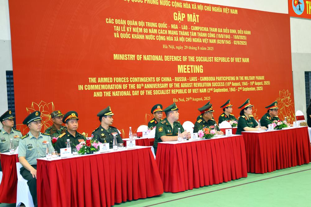 (Bqp.vn) - Ngày 29/8, tại Hà Nội, Bộ Quốc phòng tổ chức buổi gặp mặt các đoàn quân đội 4 nước Trung Quốc, Liên bang Nga, Lào và Cam-pu-chia tham gia diễu binh, diễu hành tại Lễ kỷ niệm 80 năm Cách mạng tháng Tám thành công (19/8/1945 - 19/8/2025) và Quốc khánh nước Cộng hòa xã hội chủ nghĩa Việt Nam (02/9/1945 - 02/9/2025). Thượng tướng Hoàng Xuân Chiến, Ủy viên Trung ương Đảng, Ủy viên Thường vụ Quân ủy Trung ương, Thứ trưởng Bộ Quốc phòng chủ trì buổi gặp mặt.