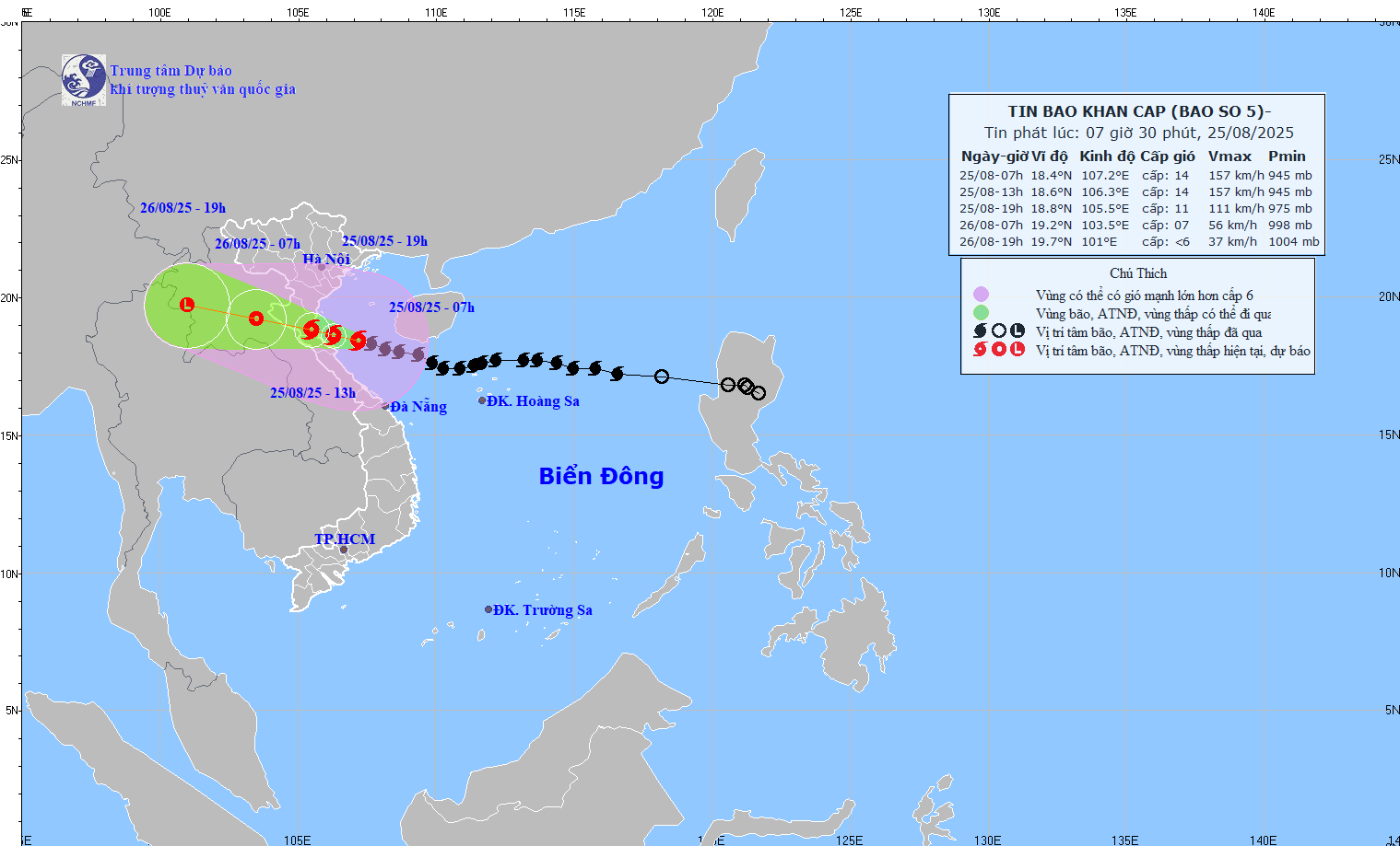 Dự kiến đường đi của Bão số 5 (ảnh: Trung tâm Dự báo khí tượng thuỷ văn quốc gia, cập nhật lúc 07 giờ 30 ngày 25/8/2025).