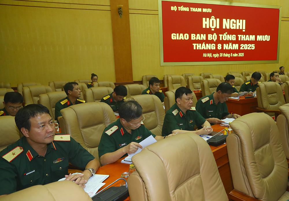 Báo cáo tại hội nghị khẳng định, trong tháng 8/2025, Bộ Tổng Tham mưu đã chỉ đạo toàn quân triển khai và hoàn thành tốt các nhiệm vụ được giao; duy trì nghiêm chế độ trực SSCĐ, nắm chắc tình hình, kịp thời tham mưu, xử lý hiệu quả các tình huống, không để bị động, bất ngờ; bảo vệ vững chắc chủ quyền lãnh thổ, phối hợp giữ vững an ninh, trật tự trên phạm vi cả nước. Cùng với đó, các đơn vị đã tổ chức huấn luyện, diễn tập, hội thi, hội thao cho các đối tượng chặt chẽ, đúng chương trình, kế hoạch; chỉ đạo lực lượng huấn luyện, cơ động, hợp luyện, tổng hợp luyện, sơ duyệt diễu binh, diễu hành kỷ niệm 80 năm Cách mạng tháng Tám và Quốc khánh 2/9 bảo đảm chặt chẽ, an toàn, kỷ luật. Tiến hành điều chỉnh tổ chức lực lượng, bảo đảm kịp thời vũ khí, trang bị theo đúng quy định; chủ động tổ chức lực lượng, phương tiện tham gia phòng, chống thiên tai, tìm kiếm cứu nạn.