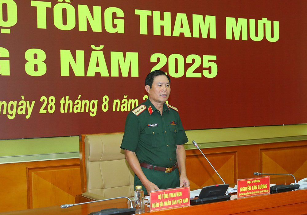 Phát biểu chỉ đạo tại hội nghị, Đại tướng Nguyễn Tân Cương biểu dương các cơ quan, đơn vị và lực lượng đã hoàn thành xuất sắc các nhiệm vụ được giao, trong đó có nhiệm vụ hợp luyện, tổng hợp luyện, sơ duyệt diễu binh, diễu hành kỷ niệm 80 năm Cách mạng tháng Tám và Quốc khánh nước Cộng hòa xã hội chủ nghĩa Việt Nam, bảo đảm chặt chẽ, an toàn, kỷ luật. Để thực hiện tốt nhiệm vụ quân sự, quốc phòng trong thời gian tới, Đại tướng Nguyễn Tân Cương yêu cầu toàn quân duy trì nghiêm chế độ SSCĐ; theo dõi, nắm chắc tình hình, nhất là trên các địa bàn trọng điểm; kịp thời tham mưu, xử lý hiệu quả các tình huống, không để bị động, bất ngờ. Chủ động phối hợp với các lực lượng giữ vững an ninh, trật tự trên phạm vi cả nước; bảo đảm an ninh, an toàn Lễ kỷ niệm 80 năm Cách mạng tháng Tám và Quốc khánh 2/9.